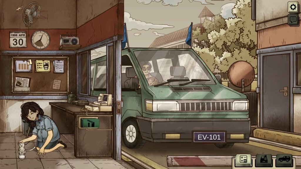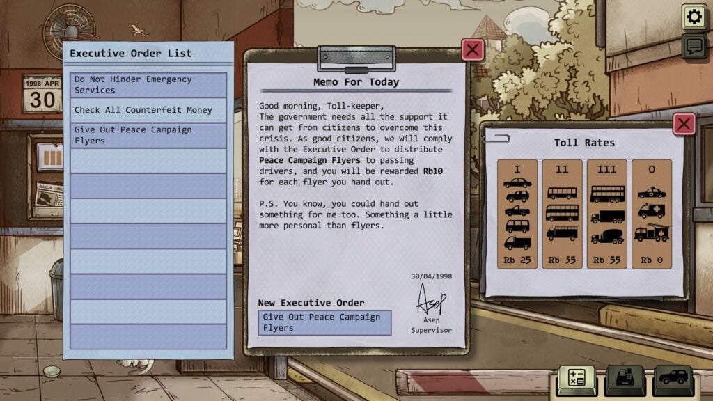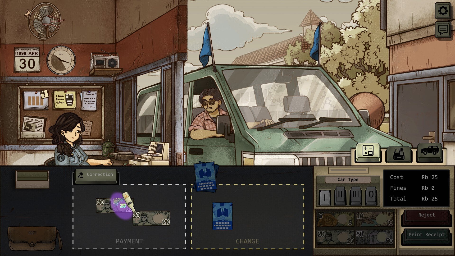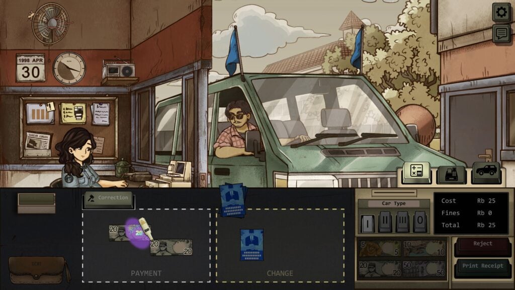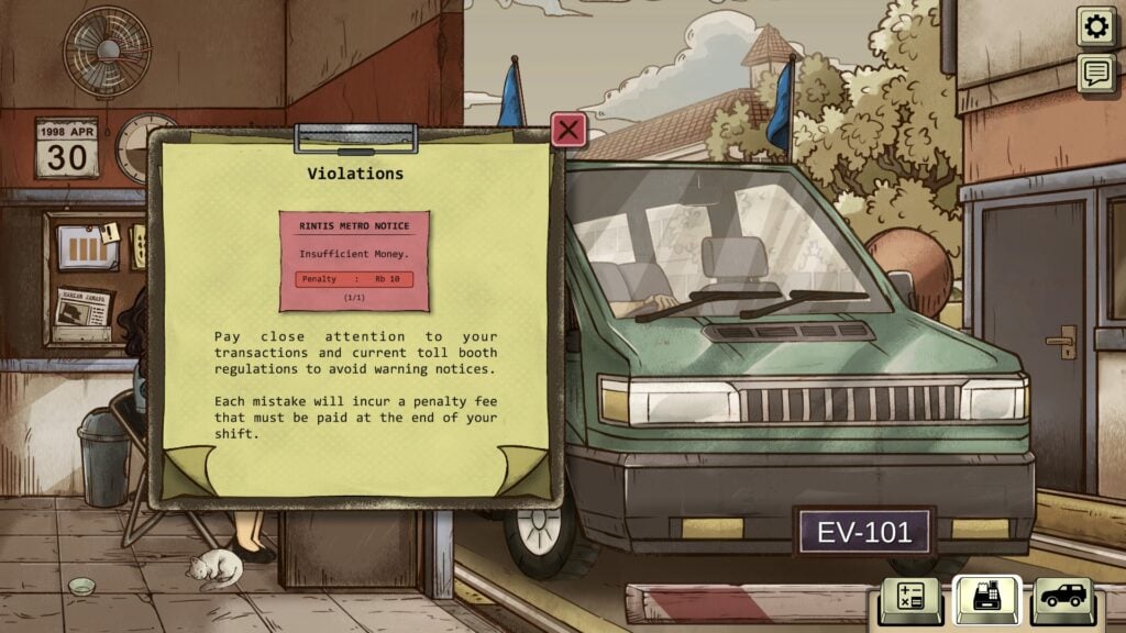 Achter Dewi hangt een prikbord met informatie die je kunt gebruiken om de juiste voertuigen door te laten. Je kunt de dagelijkse wensen van je baas hier altijd teruglezen. Ook hangt er een clipboard met informatie over de verschillende bedragen voor auto’s, bussen en vrachtwagens. In het begin is het even flink hoofdrekenen met wisselgeld, maar ook hier zijn tools voor vrij te spelen.