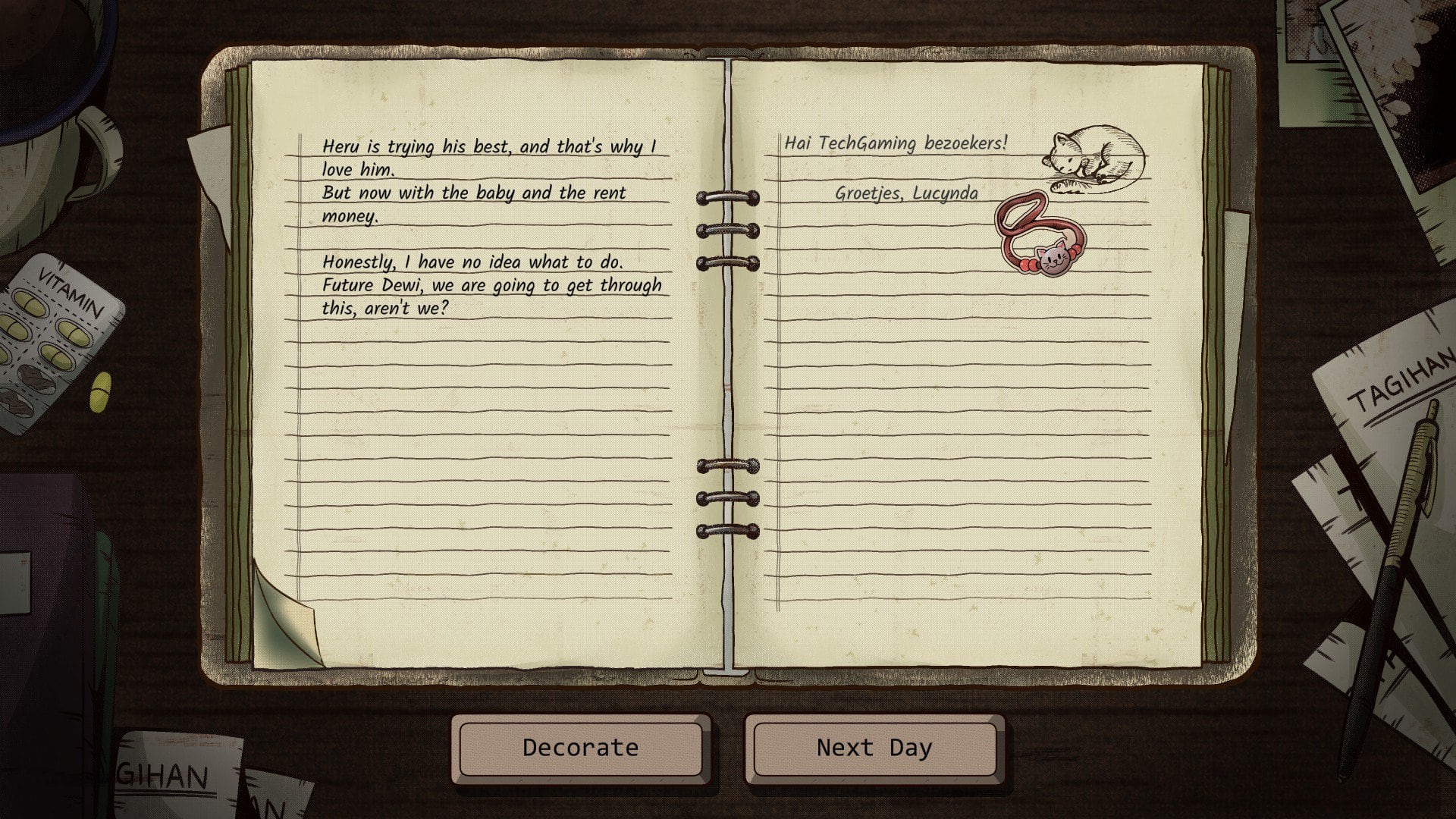 Iedere dag eindigt met een kort verhaaltje om meer context te geven aan de situatie. Denk hierbij aan een gesprekje tussen Dewi en haar man, haar beste vriendin die langskomt voor een kopje thee of de huurbazin die langskomt om te kijken of alles nog goed gaat. Na dit korte verhaaltje lees je mee in het dagboek van Dewi en kun je hier zelfs ook nog je eigen tekst en stickers aan toevoegen.