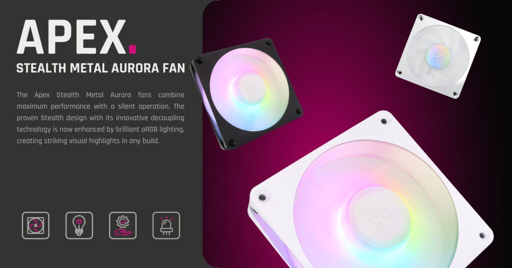 Alphacool International GmbH, gevestigd in Braunschweig, Duitsland, is een pionier op het gebied van waterkoelingstechnologie voor pc’s. Met een van de meest uitgebreide productportfolio’s in de branche en meer dan 20 jaar ervaring breidt Alphacool nu zijn assortiment uit. De Apex Stealth Metal Aurora-ventilatoren zijn eindelijk verkrijgbaar - de langverwachte upgrade van de populaire Stealth-serie. Naast hun gepatenteerde ontkoppelingstechnologie en robuuste metalen frame beschikken ze nu ook over schitterende aRGB-verlichting, waardoor ze topprestaties combineren met een werkelijk uniek visueel hoogtepunt.