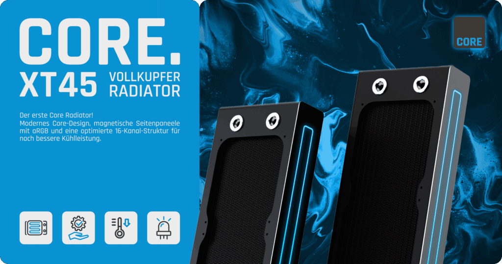 Als eerste modellen van de Core-serie combineren de Core XT45-radiatoren Alphacools vertrouwde volledig koperen constructie met een volledig vernieuwd design. De strakke, moderne look kan worden aangepast met verwisselbare zijpanelen - verkrijgbaar met geïntegreerde aRGB-verlichting of in een klassieke, onverlichte stijl. Dankzij het magnetische montagesysteem kunnen ze op elk moment snel en zonder gereedschap worden verwisseld.