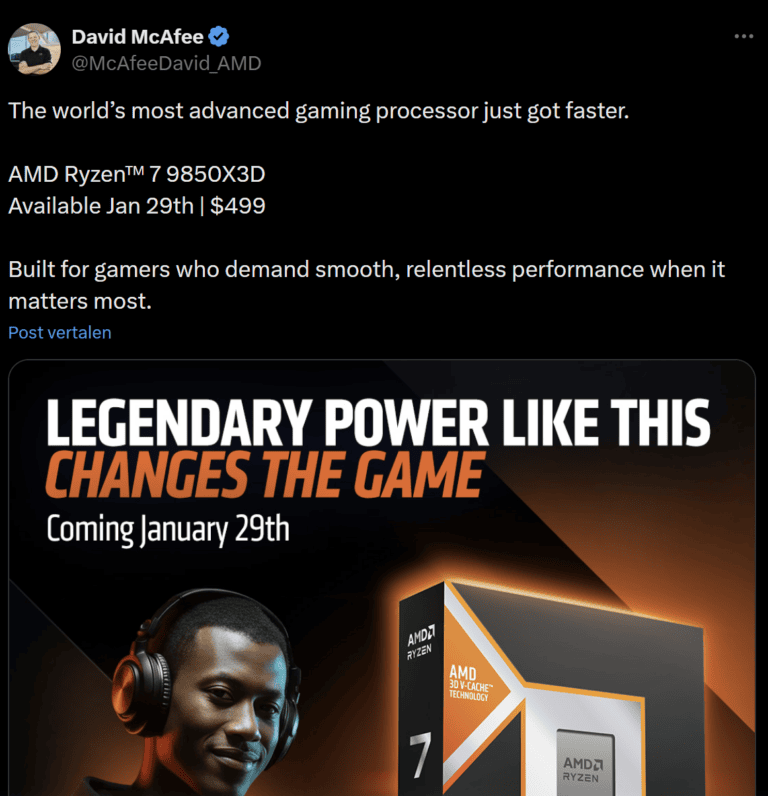 Vandaag heeft AMD aangekondigd dat de next‑gen AMD Ryzen 7 9850X3D desktopprocessor vanaf 29 januari verkrijgbaar zal zijn, met een adviesprijs van $499.