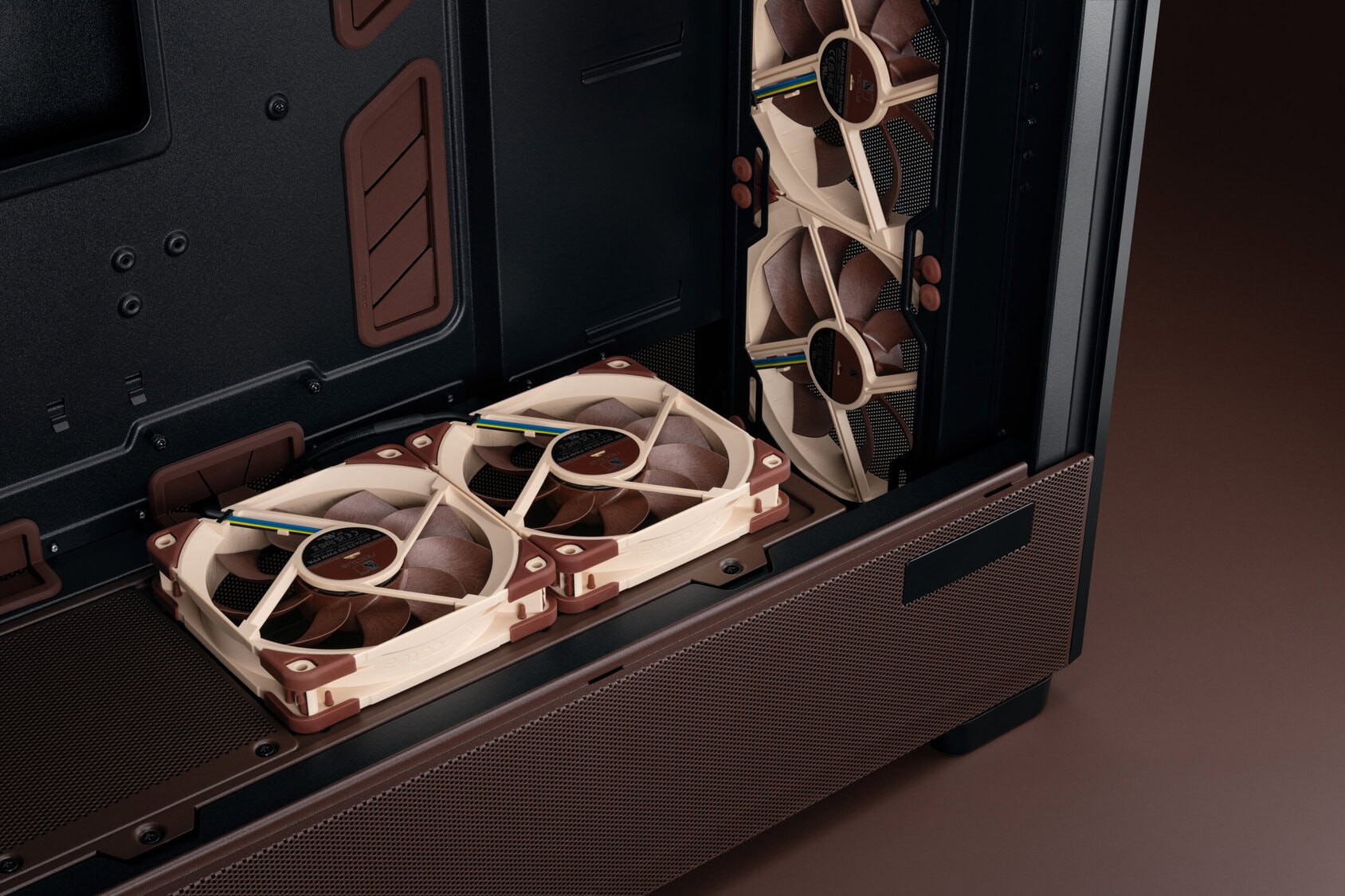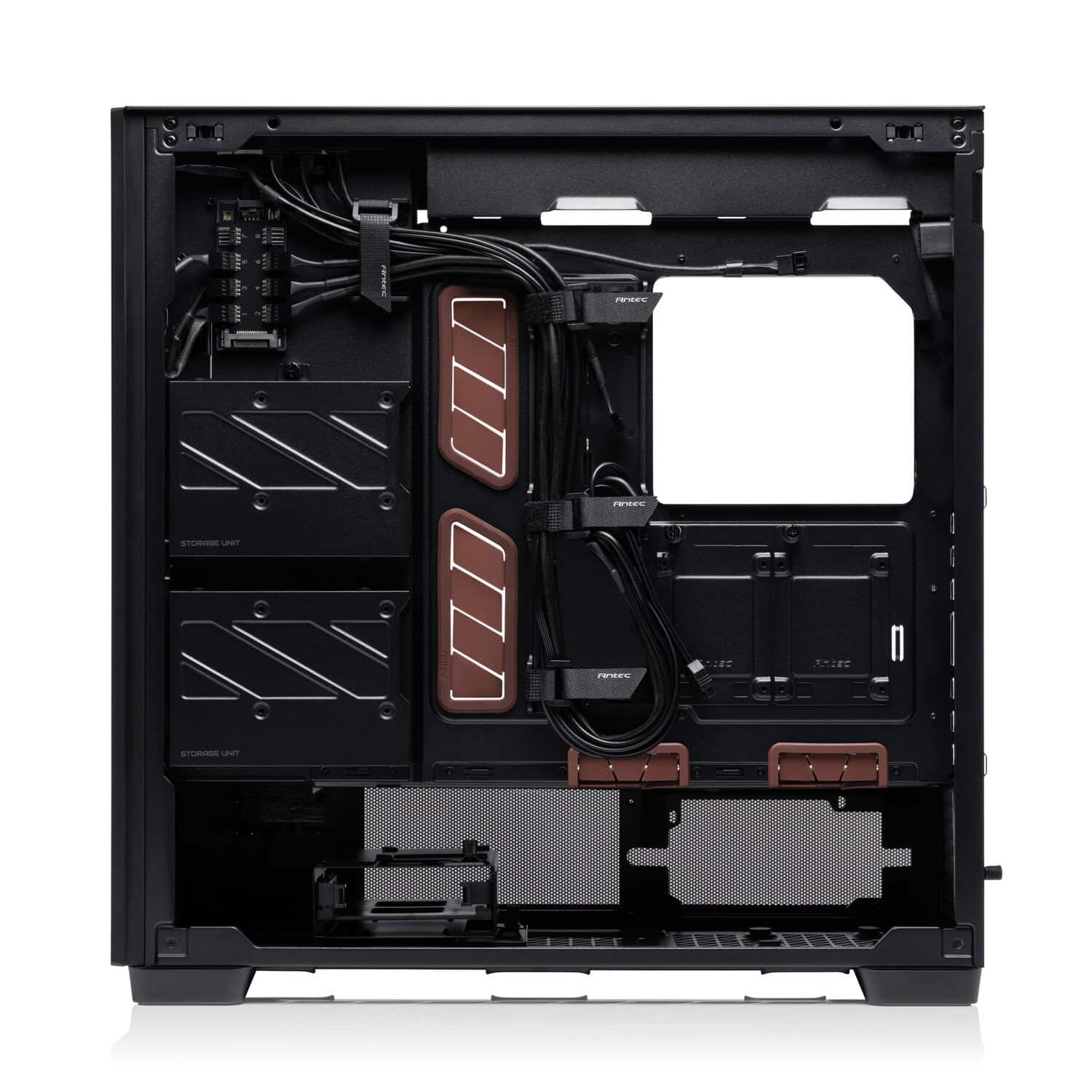 De Flux Pro Noctua Edition weerspiegelt zijn innerlijke kwaliteiten aan de buitenkant met donkerbruine accenten op het zij- en bovenpaneel, evenals bruine siliconen doorvoertules en subtiel geplaatste Noctua-logo’s op de boven-, zij- en voorkant. De Antec Flux Pro Noctua Edition draagt zijn kleuren met trots en is de perfecte keuze voor iedereen die een krachtig systeem wil bouwen dat zo stil mogelijk werkt.
