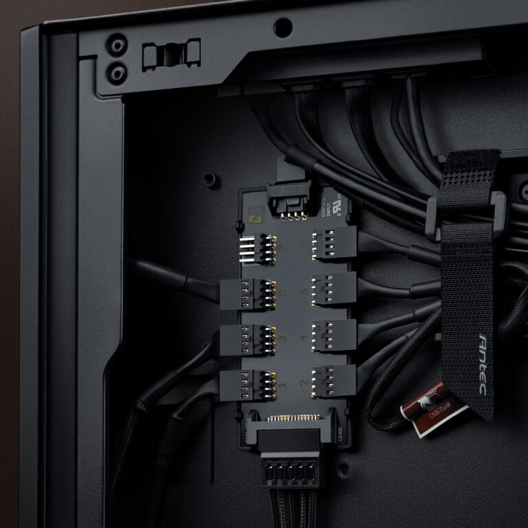 Naast de nieuwste G2-serie ventilatoren van Noctua, is de Antec Flux Pro Noctua Edition ook voorzien van de hoogwaardige NA-FH1 ventilatorhub, waarmee alle ventilatoren via één enkele ventilatoraansluiting op het moederbord kunnen worden geregeld. De NA-FH1 is al voorgeïnstalleerd en alle benodigde verlengkabels voor de ventilatoren zijn al voorgemonteerd voor maximaal gebruiksgemak.