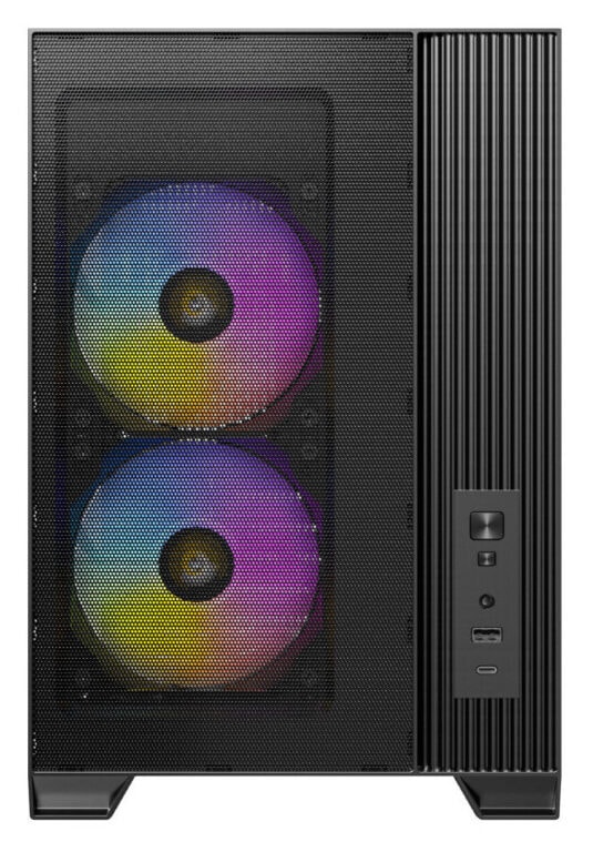 Het I/O-paneel bevat USB 3.0, USB Type-C 3.2 Gen 2, een audio-comboaansluiting en stofpluggen voor extra duurzaamheid. Extra functies zijn onder andere stoffilters aan de boven- en onderkant, twee 3,5-inch / 2,5-inch schijfposities en vijf uitbreidingsslots. De behuizing is gemaakt van staal en kunststof en heeft een zijpaneel van gehard glas voor een duidelijk zicht op de geïnstalleerde componenten.