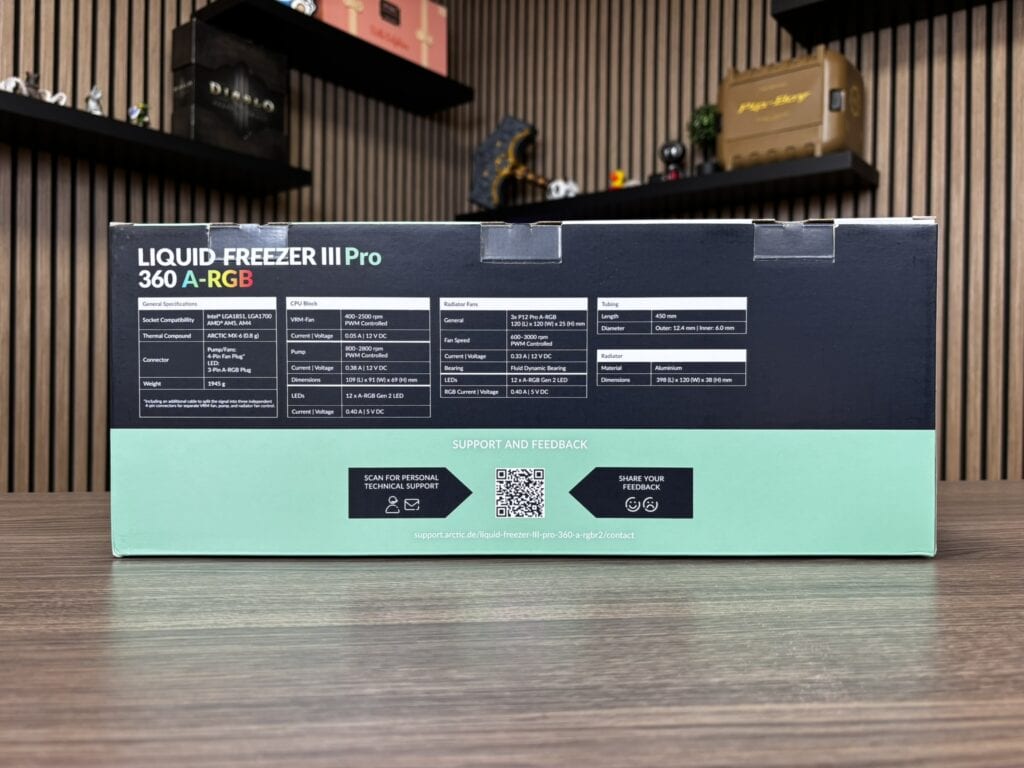 Deze showcase beginnen we zoals altijd bij de verpakking. De ARCTIC Liquid Freezer III Pro 360 komt in een keurige zwart-met-groen-doos die afgeladen is met informatie over deze koeler.