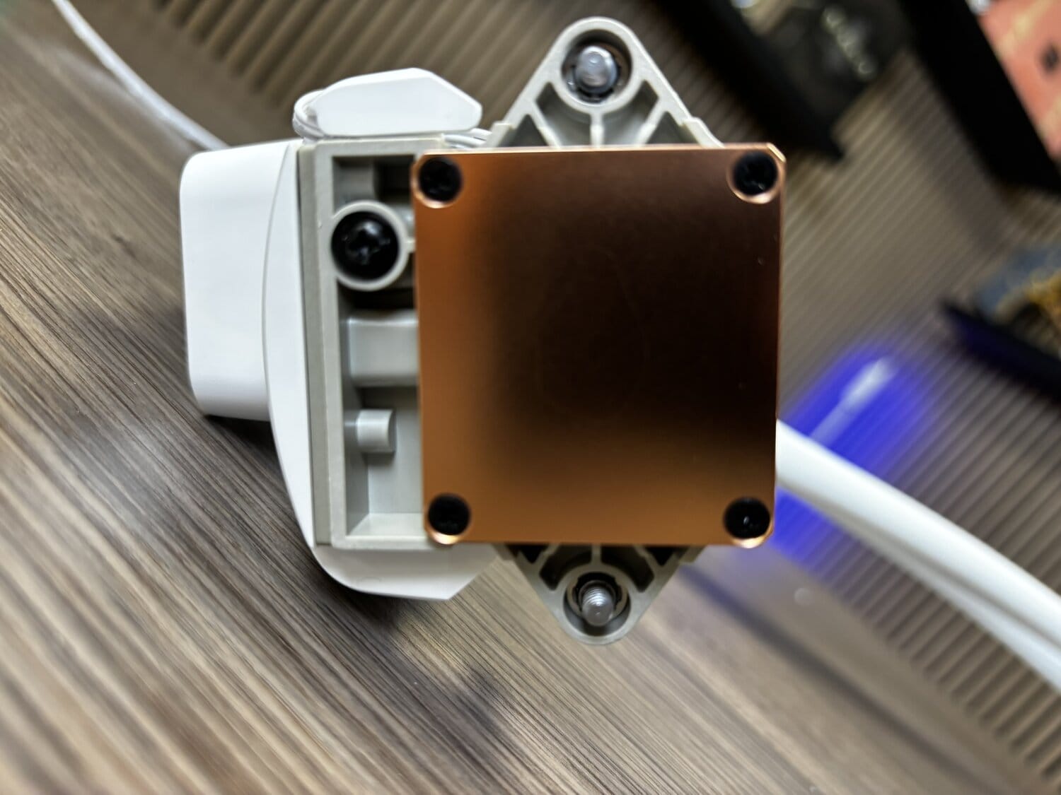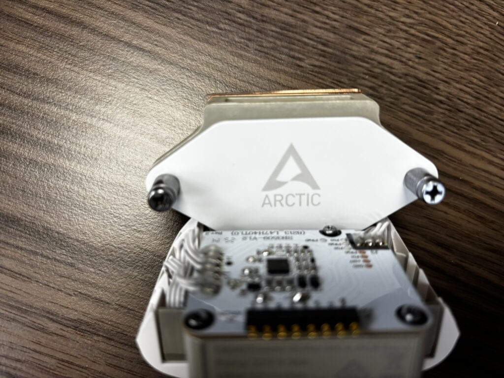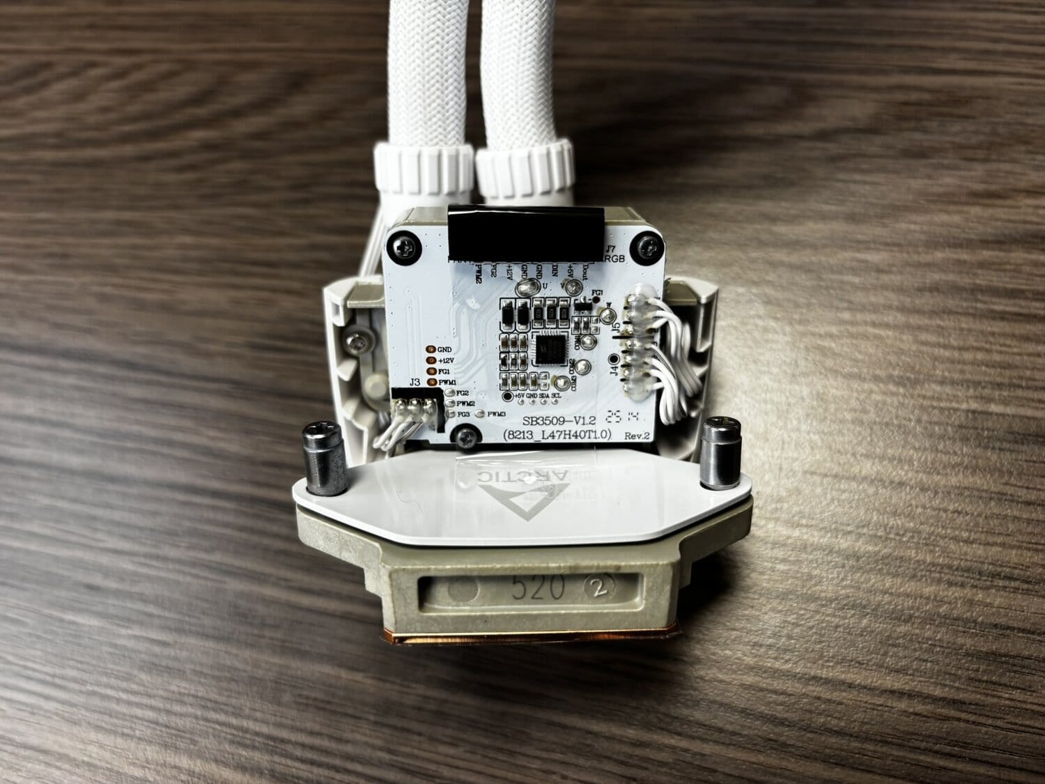 Het koelblok van de Liquid Freezer III Pro 360 A-RGB bestaat uit twee delen. Het eerste deel is het blok zelf. Hier zit ook de tubing aan vast. Bovenop het koelblok zien we een printplaat met contactpunten erop. Op deze contactpunten zal het tweede deel worden geplaatst. Hierin zit de fan voor de VRAM-koeling en natuurlijk de A-RGB-verlichting.