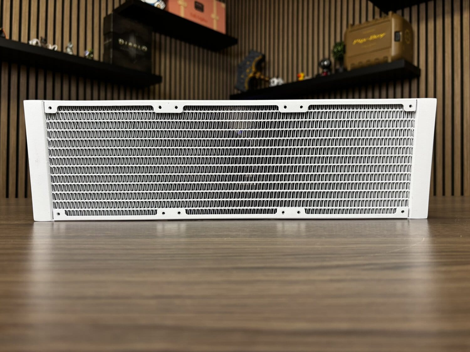 Op de 38mm dikke radiator vinden we de nieuwe P12 Pro A-RGB-fans. Deze fans staan aan de basis van deze Pro-versie van de Liquid Freezer III. Qua look is deze fan niet heel verschillend van de reguliere P12-fan, maar het verschil in specificaties liegt er niet om!