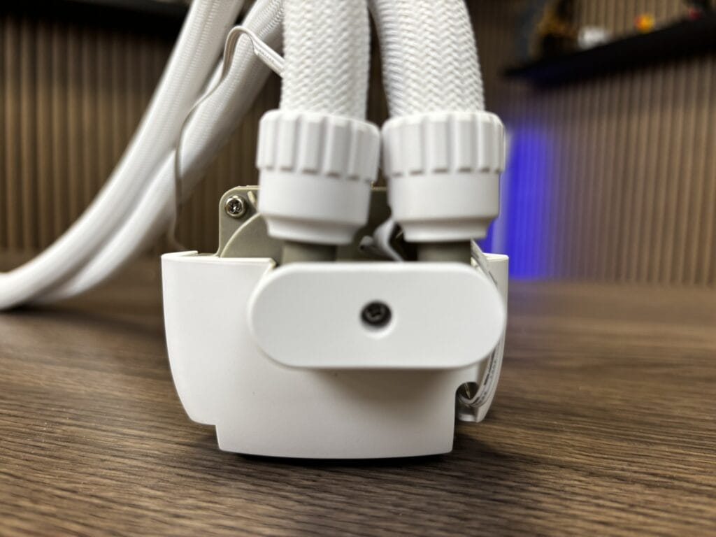 Aan het einde van de Liquid Freezer III Pro 360 zien we de tubing uit de radiator komen. Hier zien we ook dat de kabels van de fans hier in de tubing verdwijnen.