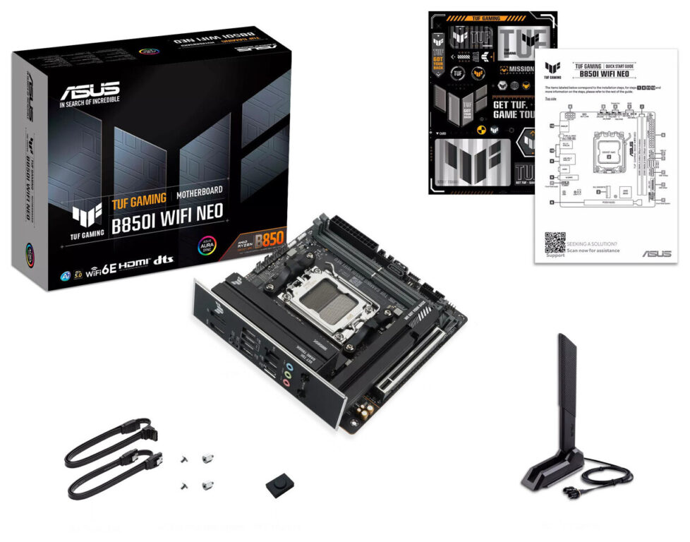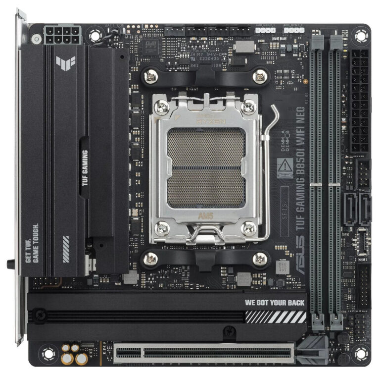 ASUS heeft de TUF Gaming B850I WiFi Neo moederborden geïntroduceerd, waarmee het TUF Gaming-merk voor het eerst verschijnt in een Mini-ITX-formaat van 17 x 17 cm. Het moederbord is gebaseerd op een AMD AM5-platform met de B850-chipset en ondersteunt Ryzen 7000-, 8000- en 9000-serie processoren. De twee geheugenslots ondersteunen DDR5-modules tot 128 GB, met snelheden die variëren afhankelijk van de CPU: tot DDR5-8200 met Ryzen 9000, DDR5-9600 met Ryzen 8000 en DDR5-8000 met Ryzen 7000. Zowel EXPO- als ASUS AEMP-profielen worden ondersteund. Het PCIe x16-slot werkt op Gen 5 met Ryzen 7000/9000-chips en op Gen 4 met Ryzen 8000. Het moederbord beschikt over twee M.2-slots en twee SATA 6 Gb/s-poorten. Het is belangrijk om te weten dat ASUS beide M.2-slots labelt als PCIe 5.0, maar de specificaties vertellen een ander verhaal: het eerste slot is een PCIe 5.0 x4-slot dat is aangesloten op de CPU bij Ryzen 7000- en 9000-processors, terwijl het tweede slot een PCIe 4.0 x4-slot is dat is aangesloten op de chipset, ongeacht de CPU.