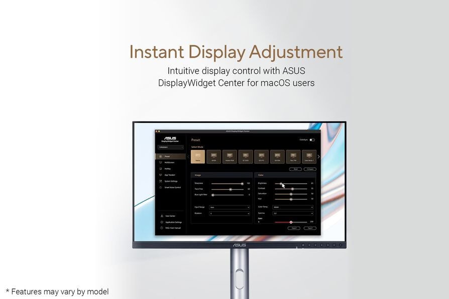 De intuïtieve ASUS DisplayWidget Center-software voor macOS stelt gebruikers in staat om eenvoudig monitorinstellingen aan te passen, zoals helderheid, contrast en kleurtemperatuur, voor een optimale kijkervaring. De app biedt gebruikers ook de mogelijkheid om de sneltoetsen van hun MacBook te gebruiken om de helderheid van het ProArt-scherm aan te passen.