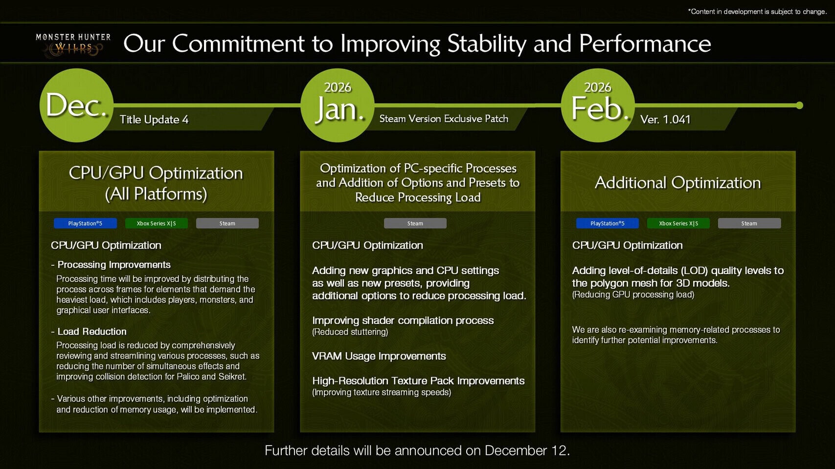 Om de stabiliteit en prestaties verder te verbeteren, zullen er eind januari 2026 extra verbeteringen worden doorgevoerd in een patch die exclusief voor de Steam-versie beschikbaar is, evenals in de Ver. 1.041-update in februari. We willen van deze gelegenheid gebruik maken om iedereen die problemen heeft gemeld en feedback heeft gegeven, hartelijk te bedanken. Jullie feedback heeft het ontwikkelingsteam geholpen bij hun voortdurende werk om de algehele ervaring met deze updates te verbeteren. We willen graag de roadmap voor stabiliteits- en prestatieverbeteringen, die werd getoond in de Monster Hunter Showcase van december 2025, verder toelichten.