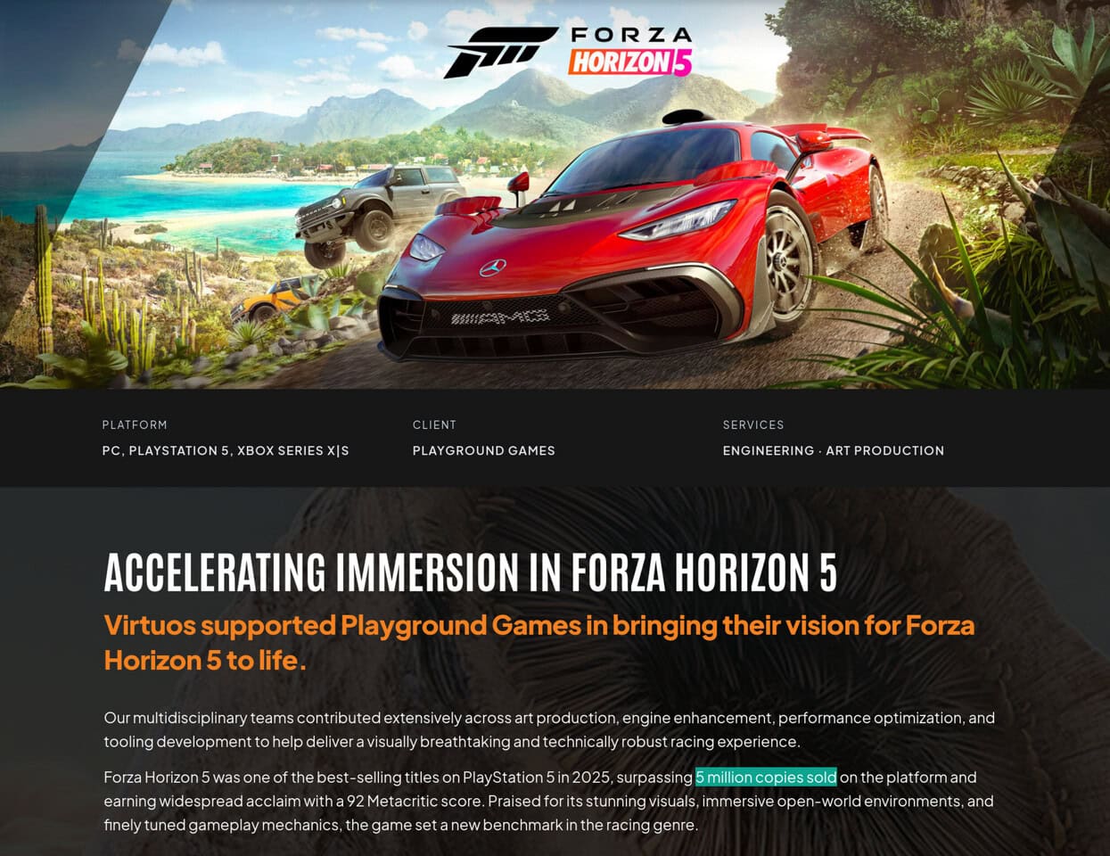Volgens een update op de website van Virtuos Games - een gamestudio die Playground Games hielp bij de ontwikkeling van Forza Horizon 5 voor de PS5 - heeft Forza Horizon 5 meer dan 5 miljoen exemplaren verkocht op de console van Sony alleen. Dit komt bijna overeen met de geschatte verkoopcijfers voor de Steam-versie van de game, die ergens tussen de 7,24 miljoen en 8,36 miljoen liggen, afhankelijk van welke analysegegevens je raadpleegt. Dit ondanks het feit dat Forza Horizon 5 pas in 2025 op PlayStation 5 verschijnt, bijna vier jaar na de oorspronkelijke release op pc en Xbox. Dit soort tijdelijke exclusiviteit lijkt sterk op het model dat Sony met veel van zijn games hanteert en waar Microsoft grotendeels van is afgestapt, maar waar ze in de toekomst mogelijk weer naar terugkeren. Forza Horizon 6 verschijnt momenteel op 19 mei, met een releasedatum voor de PS5 later in 2026.