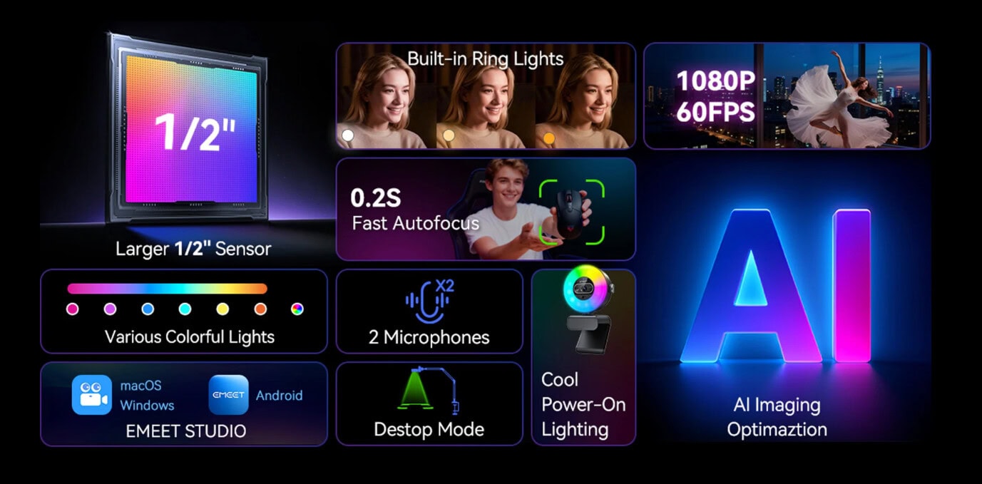 Vergeleken met de vorige EMEET S600 beschikt de EMEET S600L over een verbeterd beeldvormingssysteem met een grotere 1/2″-beeldsensor en een ingebouwde ringverlichting, wat zorgt voor een consistentere beeldkwaliteit onder verschillende lichtomstandigheden. De geïntegreerde verlichting is ontworpen om synchroon te werken met het beeldvormingssysteem van de camera en vermindert harde schaduwen en verbetert de scherpte van gezichten zonder dat externe verlichting nodig is. Meerdere belichtingsmodi en instelbare helderheidsniveaus stellen gebruikers in staat zich eenvoudig aan te passen aan verschillende scènes en creatieve behoeften.