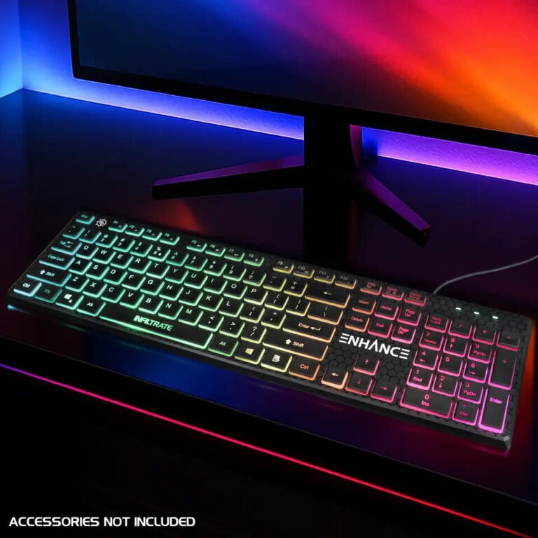 Het Infiltrate 3 Gaming Toetsenbord maakt de collectie compleet en combineert hybride mechanische schakeltechnologie met een compacte vormfactor. Elke toetsaanslag levert voelbare feedback en behoudt tegelijkertijd duurzaamheid. Met 26-toetsen rollover, anti-ghostingtechnologie, WASD-pijltjestoetsen, Windows-vergrendeling en 12 multimedia-snelkoppelingen is dit toetsenbord geschikt voor zowel intensief gamen als dagelijks typen. Kies uit 9 verlichtingsmodi of 7 effen kleuren die passen bij jouw favoriete stijl.