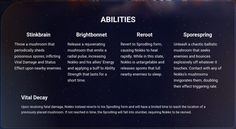 Nokko is het nieuwste speelbare frame in de game en het 62e warframe dat is uitgebracht sinds de game in maart 2013 in de open bètaversie verscheen. Qua esthetiek en vaardigheden volgt Nokko een paddenstoelthema, met vaardigheden zoals het verspreiden van giftige, besmettelijke sporen, het planten van een gloeiende paddenstoel voor een buff en het afvuren van explosieve paddenstoelprojectielen. Nokko kan worden gebouwd met behulp van blauwdrukken die je verdient door de nieuwe Undermined-missie te voltooien en onderdelen die je kunt farmen in The Deepmines op Fortuna.
