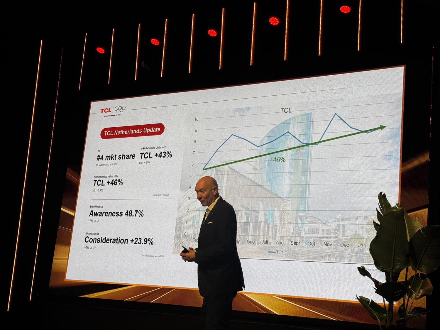 Op een gegeven moment volgde een presentatie vanuit het management van TCL, waarin werd toegelicht waar het merk momenteel staat als organisatie. In Nederland staat TCL op dit moment op de vierde plaats als best verkopend merk. Daarnaast is het merk marktleider op het gebied van Mini LED-televisies en grote schermformaten vanaf 75 inch.
