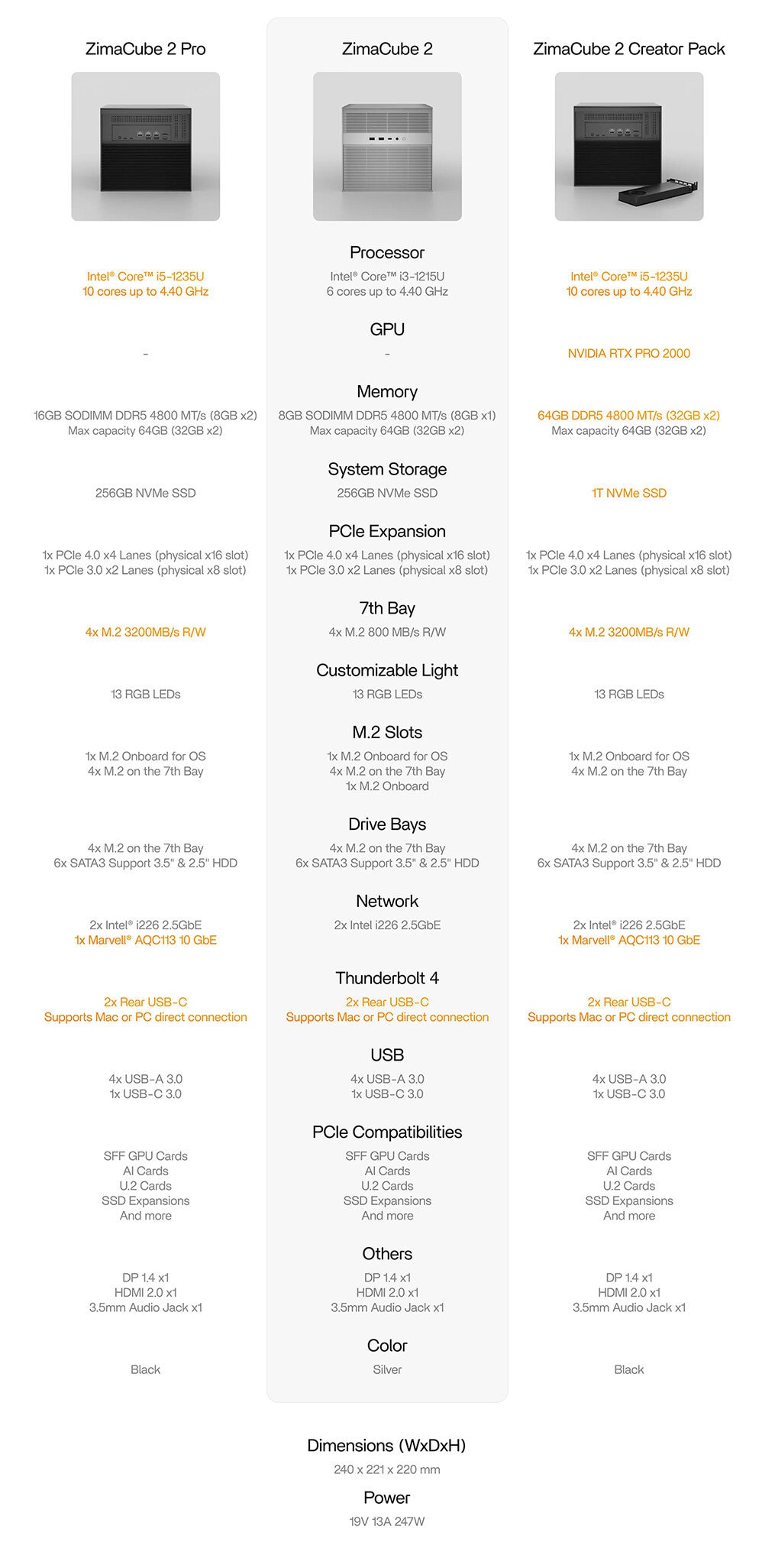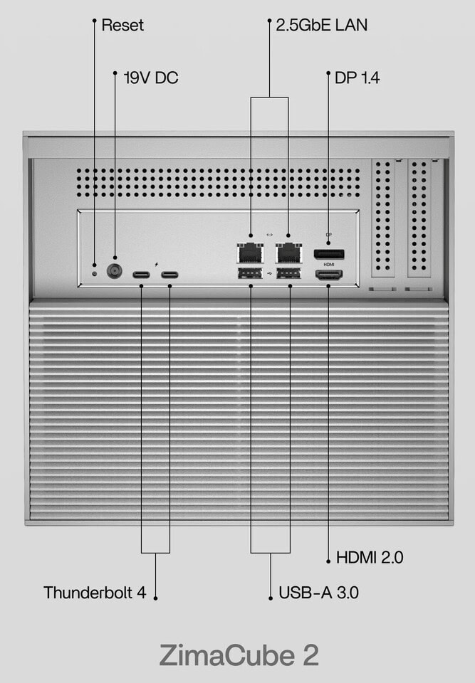 De ZimaCube 2, een compact NAS- en mini-serverplatform van IceWhale, is aangekondigd en kan nu worden voorbesteld. De serie is gebouwd rond 12e generatie Intel Alder Lake-processors en omvat een standaardmodel met een i3-1215U CPU, een Pro-variant met de i5-1235U-processor en een Creator Pack met extra GPU-ondersteuning. Met afmetingen van 240 x 221 x 220 mm is hij compact, maar ruim genoeg voor high-end configuraties zonder krap aan te voelen. Qua opslag zijn er zes bays beschikbaar voor 3,5-inch of 2,5-inch schijven, zowel SATA III als NVMe, en tot vier M.2-slots voor extra capaciteit. De totale opslagcapaciteit kan oplopen tot 164 TB, afhankelijk van de configuratie. Uitbreidingsmogelijkheden zijn er twee PCIe-slots: een full-size PCIe 4.0 x16 (fysiek x4 lanes) voor GPU’s en een PCIe 3.0 x8 (fysiek x2). Het apparaat ondersteunt netwerkkaarten of NVMe-uitbreiding. De connectiviteit is uitstekend met twee Thunderbolt 4-poorten, vier USB 3.0 Type-A-poorten, twee 2,5 GbE Ethernet-poorten en optioneel 10 GbE op de duurdere modellen. HDMI- en DisplayPort-uitgangen zijn aanwezig voor beeldschermondersteuning.