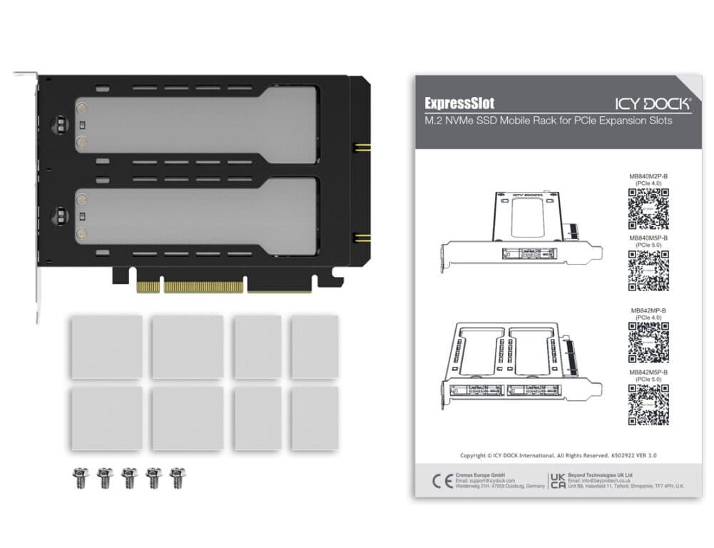 Als u een 2,5″ SATA SSD via een PCIe-sleuf wilt installeren, is ICY DOCK de oplossing! De ExpressSlot Elite MB839SP-B is compatibel met de PCIe 2.0-sleuf of hoger en biedt hot-swap mogelijkheden. Combineer hem met de EZConvert MB703M2P-B M.2 SATA naar 2,5″ SATA HDD-adapter om een M.2 SATA SSD en 2,5″ HDD/SSD binnen het MB839SP-B receiverframe te verwisselen voor uitstekende compatibiliteit met diverse schijven.