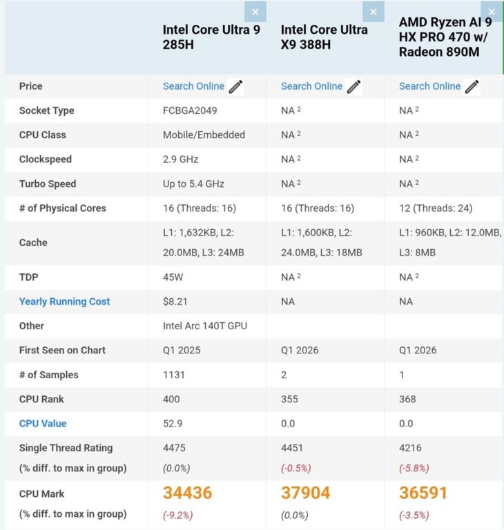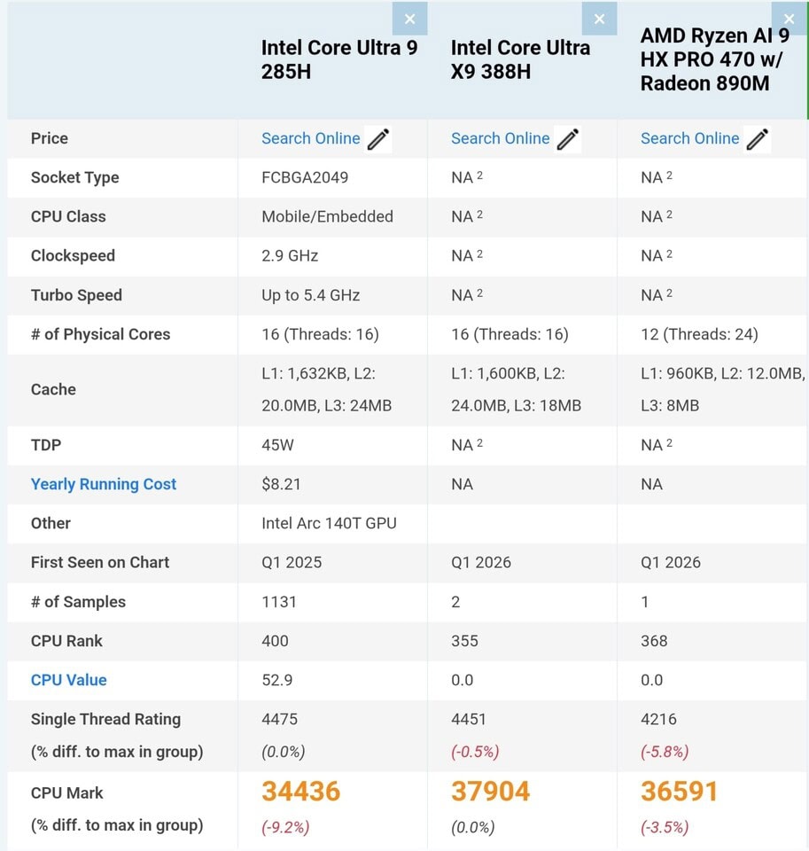 Ter vergelijking: de AMD Ryzen AI 9 HX Pro 470 behaalde in dezelfde PassMark‑tests 36.591 punten (multi‑core) en 4.216 punten (single‑core). Daarnaast werd de geïntegreerde GPU van de X9 388H eerder al getest in Cyberpunk 2077, waar deze naar verluidt ongeveer dubbel zo snel presteerde als AMD’s Strix Halo Radeon 890M‑iGPU.