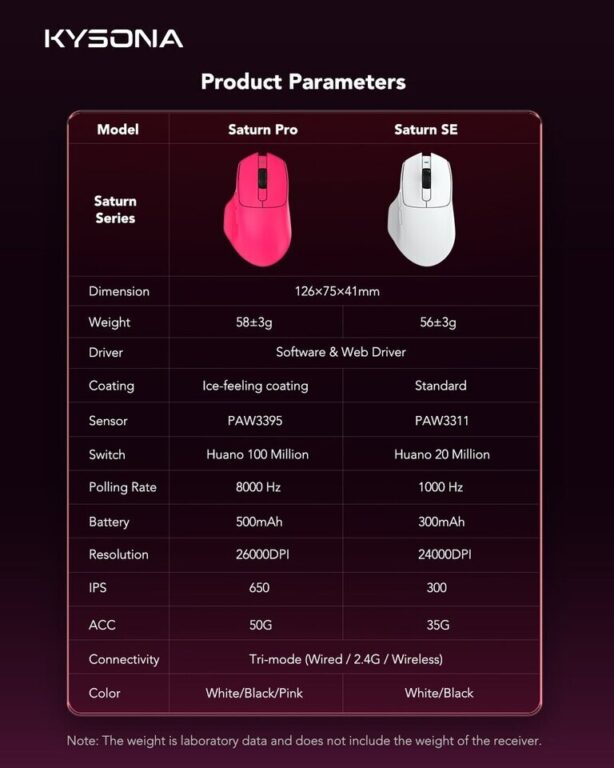 Kysona staat bekend om zijn betaalbare, hoogwaardige gaming-randapparatuur. Eerder bracht het merk al de draadloze symmetrische gamingmuizen Jupiter en Mercury uit, die 40-46 gram wegen. Nu heeft het merk de Saturn-serie aangekondigd, die dezelfde sensor en MCU-hardware als de eerdergenoemde symmetrische modellen in een ergonomische behuizing combineert. De Saturn-serie is verkrijgbaar in twee varianten: het duurdere Pro-model, met een PixArt PAW 3395-sensor en een grotere 500 mAh-batterij, en de Saturn SE, die de PixArt PAW 3311-sensor gebruikt, de pollingfrequentie van 8 kHz achterwege laat, een andere coating heeft en ongeveer 2 gram lichter is - 56 gram voor de SE, 58 gram voor de Pro.