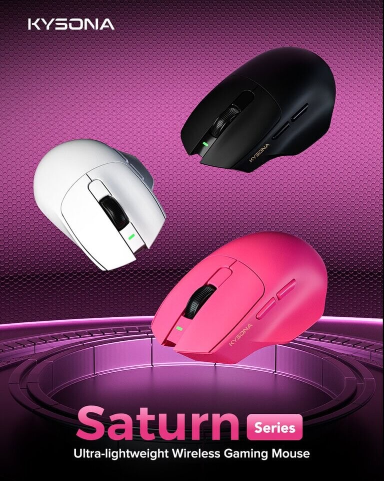 De behuizing van de Saturn-gamingmuizen doet denken aan die van bijvoorbeeld de Razer Basilisk V3 of de recentere McHose G7-serie - oftewel, de Saturn is een ergonomische gamingmuis voor rechtshandigen met een duimsteun. Kysona suggereert dat de vorm is geoptimaliseerd voor zowel palm- als klauwgreep en dat de “ijzige coating" zweetbestendig is en helpt de grip te behouden tijdens intense gamesessies. De Saturn meet 126 × 75 × 41 mm, waardoor hij 4 mm korter is dan de eerder genoemde Razer Basilisk en 5 mm korter en 4 mm smaller dan de befaamde Logitech G502. De Saturn lijkt ook iets meer palmsteun te bieden en een uitgesproken kromming naar rechts te hebben aan de achterkant van de muisbehuizing. Er worden geen specifieke switches of encoders genoemd, maar een afbeelding op de website suggereert dat de Saturn-muizen gebruikmaken van Huano 100M Transparent Green Shell White Dot-switches, een mechanische switch met gemiddelde kracht en een MTBF van 100 miljoen klikken. Naast de hoofdklikknoppen heeft de Saturn twee programmeerbare zijknoppen en beide modellen beschikken over bedrade, 2,4 GHz en Bluetooth-connectiviteit. De Saturn Pro is verkrijgbaar in zwart, roze en wit en kost $35,99 na een introductiekorting van 60%, terwijl de Saturn SE verkrijgbaar is in wit of zwart en $24,99 kost na dezelfde introductiekorting. Dit model wordt geleverd met een oplaadstation dat tevens als ontvangerverlenger fungeert.