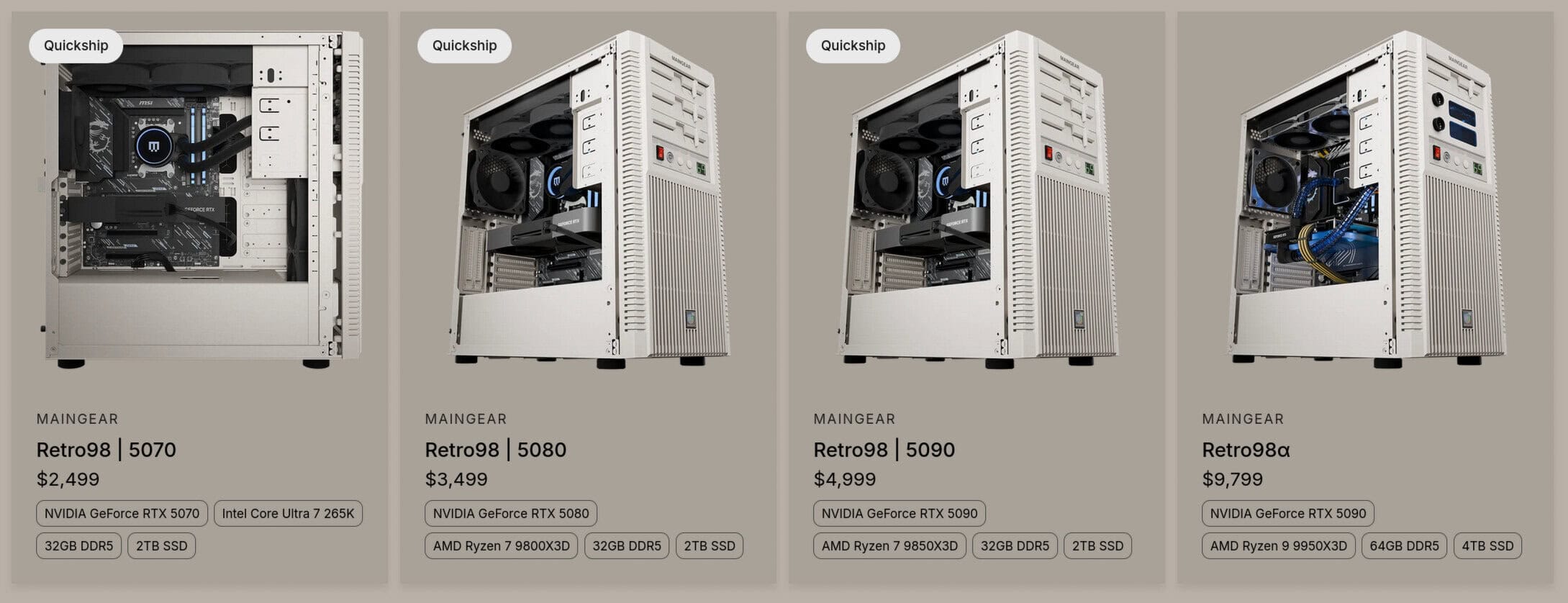 Intern gezien begint de Retro98-serie met de Intel Core Ultra 7 265K in combinatie met 32 GB DDR5-6400 RAM, een 2 TB NVMe Gen 5 SSD en een NVIDIA GeForce RTX 5070, met de AMD Ryzen 7 9800X3D en RTX De 5080 is verkrijgbaar vanaf $ 3.499. Voor $ 4.999 krijg je een RTX 5090, een Ryzen 7 9850X3D, en de Retro98α van $ 9.799 is uitgerust met een AMD Ryzen 9 9950X3D, 64 GB RAM, een 4 TB SSD en een RTX 5090.