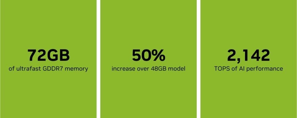 Bovendien kunnen ontwikkelaars met 72 GB ultrasnel GDDR7-geheugen - een toename van 50% ten opzichte van het 48 GB-model - grotere modellen lokaal trainen, verfijnen en prototypen.