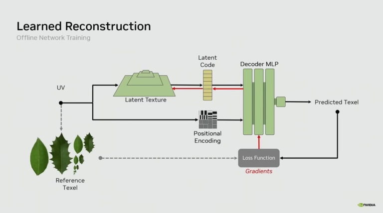 Neurale textuurcompressie werkt door een neuraal netwerk te trainen om te begrijpen hoe een texel, de basispixel van een textuurkaart, eruitziet op een specifiek materiaal. NVIDIA heeft deze neurale netwerken getraind voor bijna elk gamemateriaal, waardoor ze klaar zijn voor daadwerkelijke implementatie in games. Dit proces is zo verfijnd dat de output ofwel een realistischere versie bovenop de basistextuurlaag van de game kan leveren, ofwel dezelfde textuurweergave kan behouden voor aanzienlijke VRAM-besparing. Voor een volledige technische uitleg en een kijkje achter de schermen van neurale textuurcompressie kunt u de uitgebreide YouTube-video over deze technologie bekijken.