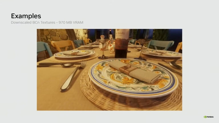 Als we naar het interieur kijken waar het serviesgoed te zien is, zien we hoe NVIDIA’s NTC-technologie de verkleinde BCn-texturen overtreft en een veel beter resultaat levert, terwijl het dezelfde 970 MB VRAM-capaciteit gebruikt.