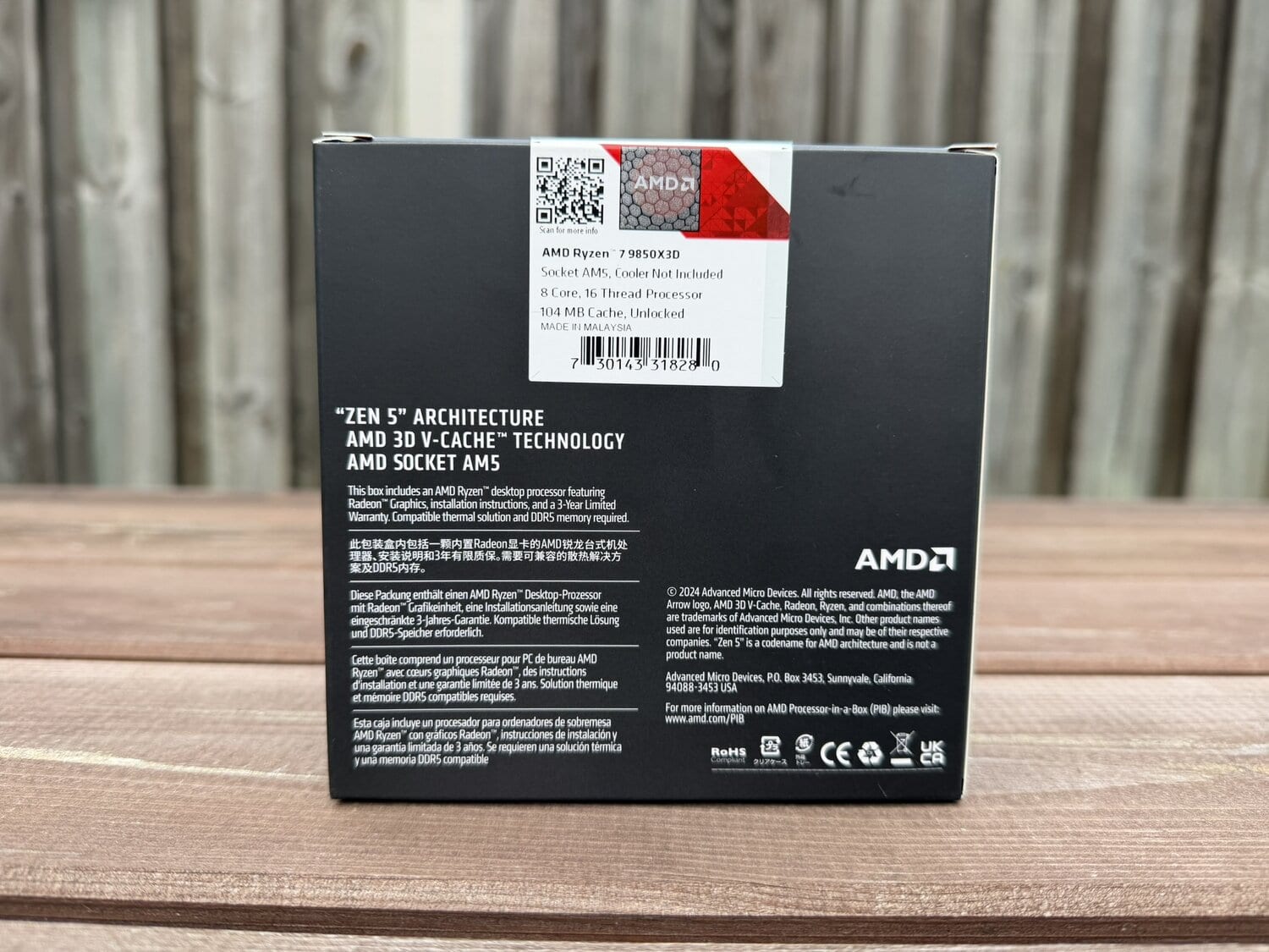De AMD Ryzen 7 9850X3D komt in een vergelijkbaar omhulsel als dat van de 9800X3D. Het is het bekende verhaal, bestaande uit de processor, een certificaat van authenticiteit en een Ryzen-sticker. Ten opzichte van de Ryzen 9000-serie verpakking is er een zilverkleuraccent aangebracht. Op de onderstaande foto’s vind je een AMD Ryzen 7 9800X3D- en AMD Ryzen 7 9850X-verpakking naast elkaar en een paar foto’s van de voor- en achterkant van de 9850X3D-verpakking.