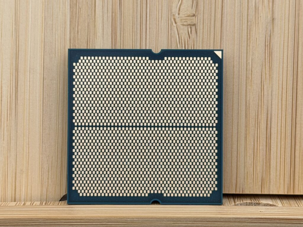 De Ryzen 7 9850X3D zelf ziet er hetzelfde uit als elke Ryzen 9000-serieprocessor, met de welbekende heatspreader waar een aantal happen uit lijken te zijn genomen. Een groot voordeel van de huidige AMD5-processoren blijft toch wel dat er geen pinnetjes meer op de processor zelf zitten aan de onderkant. Hierdoor heb je ook niet zo snel een gebogen of afgebroken ‘pin’, die bij AM4 nog weleens voor wilde komen als je net te snel was met het vastklikken van de processor in de socket.