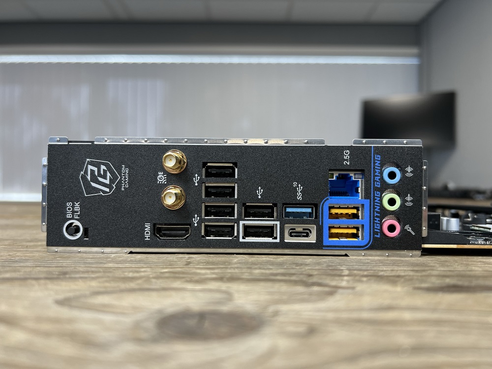 Het moederbord I/O bestaat uit een BIOS Flashback-knop, een HDMI 2.1-poort, zes USB 2.0 poorten, twee USB 3.2 Gen1 poorten, twee USB 3.2 Gen2 poorten waarvan één Type-C, een 2,5Gbps-ethernetpoort (Killer), twee SMA-aansluitingen voor de meegeleverde antenne (Wi-Fi 6E en Bluetooth 5.2) en drie audiojacks. De ASRock X670E Pro RS heeft in tegenstelling een DisplayPort 1.4, meer USB poorten met hogere snelheden en een optische audio ingang.