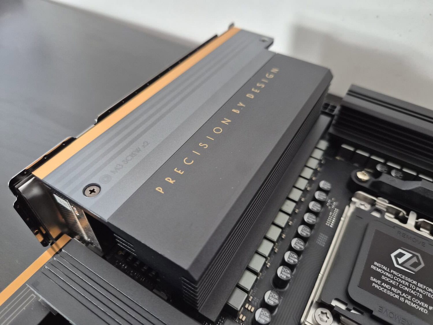 Vlak onder de heatsink zien we de slot voor de M.2-SSD met PCIe 5.0-ondersteuning. De PCIe 5.0-ondersteuning geldt ook voor het PCIe-expansieslot voor de GPU, welke beschikt over een EZ Release. Onder de grotere heatsink vinden we 3 extra M.2-sloten, waarvan enkel het bovenste PCIe 5.0 ondersteunt.