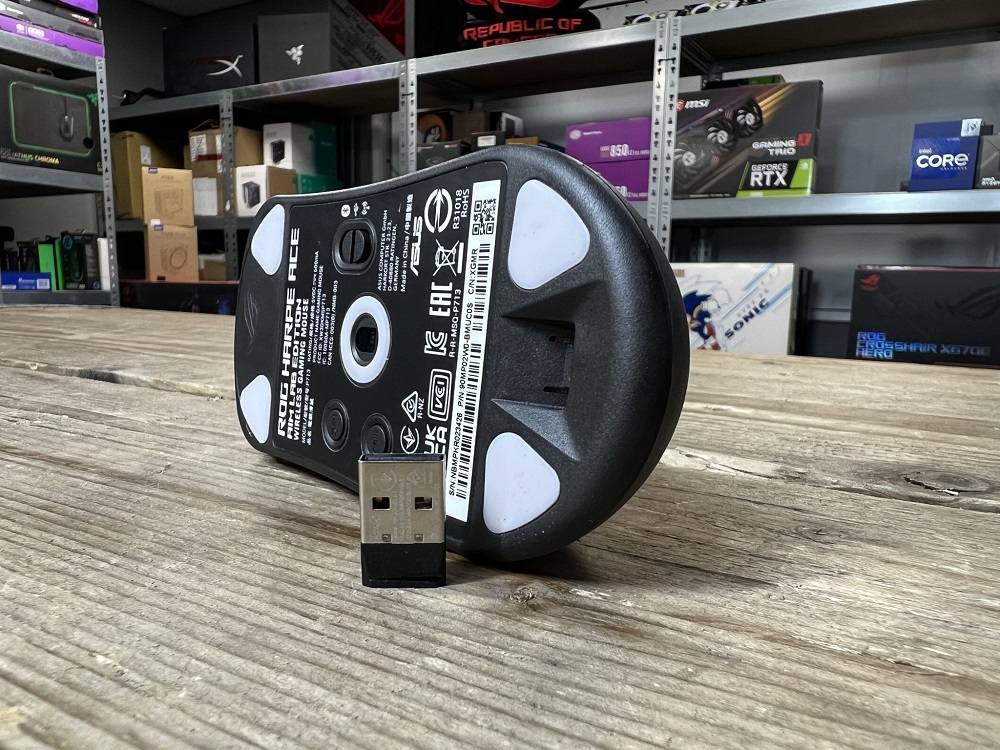 Onder op de muis is een viertal PFTE-voetjes (teflon) te vinden van circa 0,6 mm dikte. De onderzijde heeft een uitsparing voor de USB-dongel. Daar waar aan de voorzijde van het ontwerp een USB Type-C-aansluiting siert. We vinden hier nog een tweetal knoppen, bestaande uit een DPI-knop en pairknop. De DPI-knop synchroniseert zich met het interne geheugen, dat te benaderen is middels de Armoury Crate-software. De pairknop is voor de Bluetooth-connectiviteit, gezien de ROG Harpe Ace gebruikmaakt van de zogenoemde Tri-mode-connectiviteit middels 2,4 GHz, Bluetooth en een bekabelde verbinding.