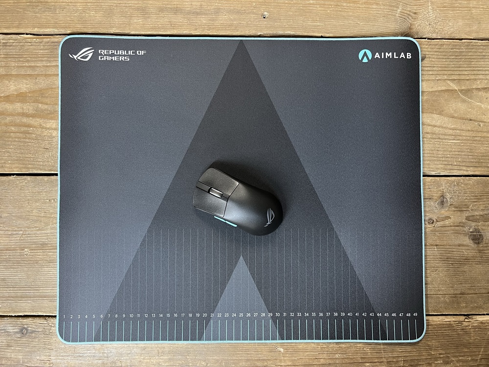De ROG Hone Ace heeft een formaat van 508 (L) x 420 (B) x 3 mm (H). De onderzijde bestaat uit rubber voor maximale grip. De combinatie van de ROG Harpe Ace en de ROG Hone Ace oogt natuurlijk het meest bevredigend. De cyaan kleurcombinatie tussen de twee, afkomstig van het Aim Lab-logo, maken dit compleet.