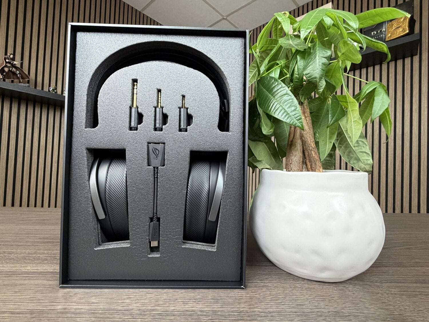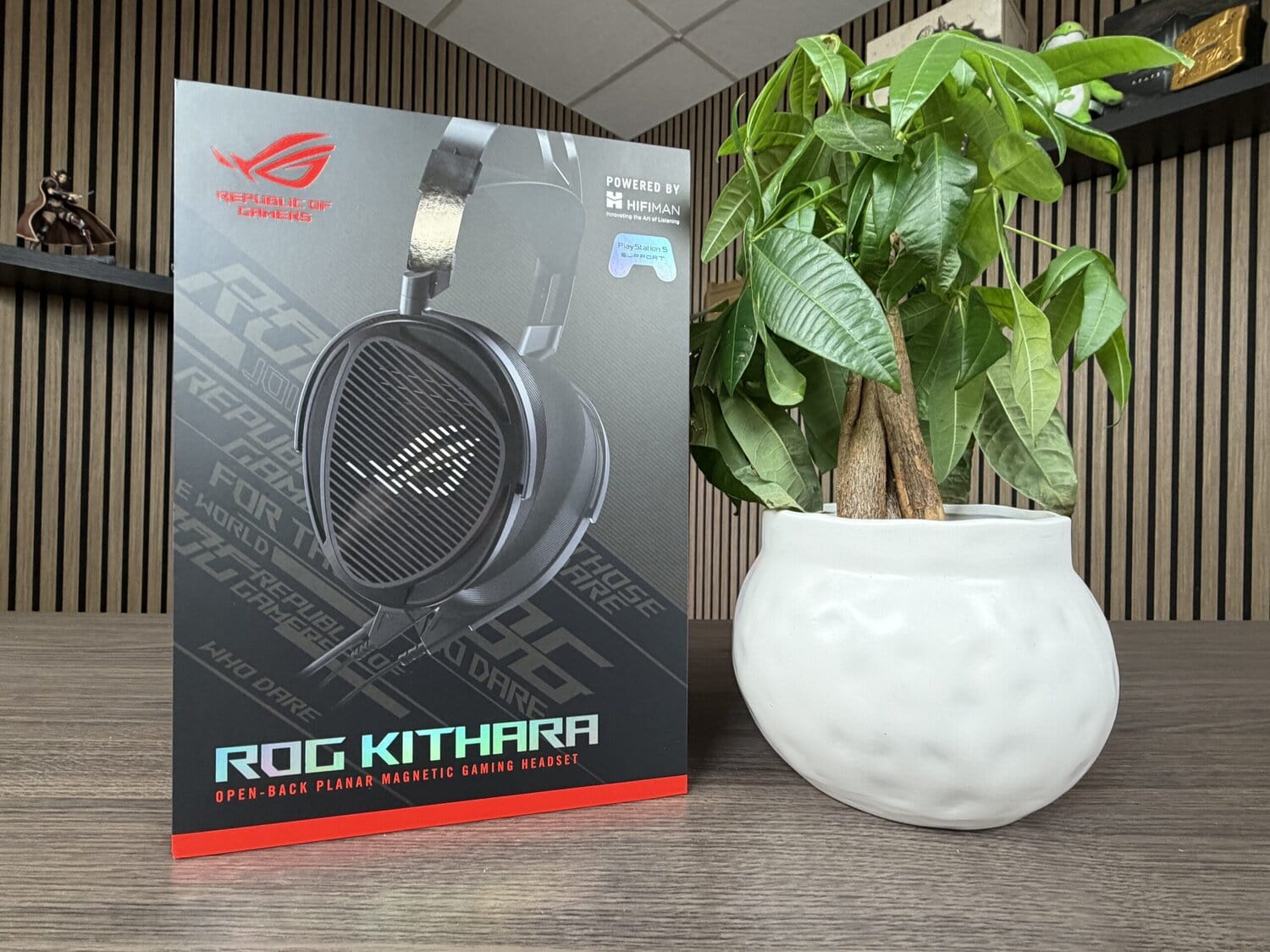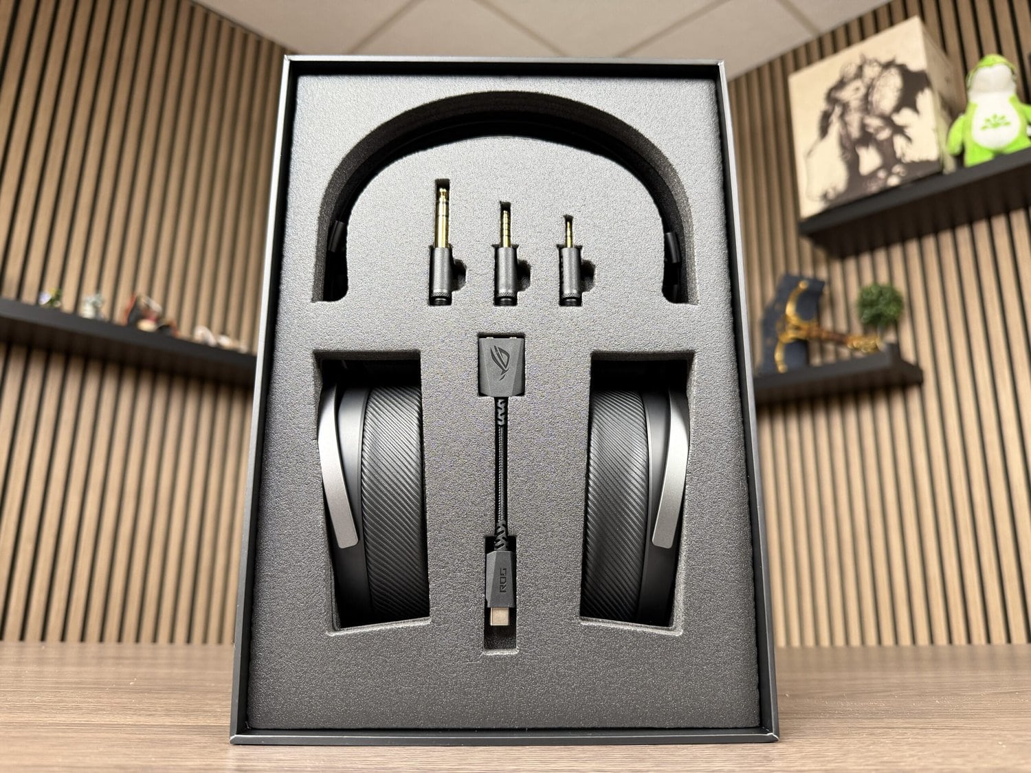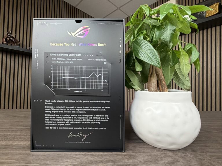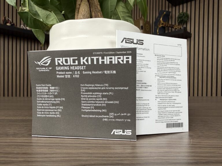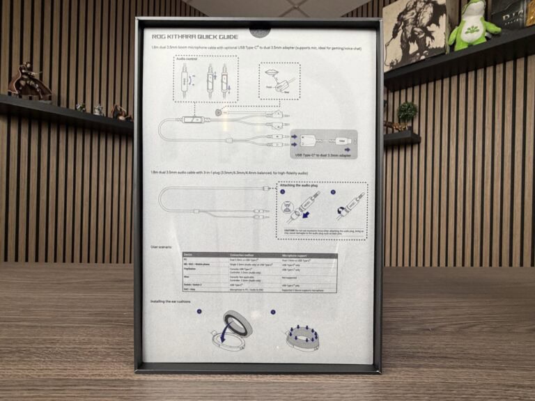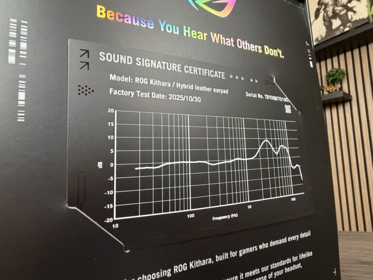 De ROG Kithara komt in een luxueuze verpakking. Zodra je de verpakking opent, krijg je een ‘geluidskalibratie-kaart’ die specifiek toebehoort bij de headset. Uiteraard benadrukt men hier de samenwerking met HIFIMAN.