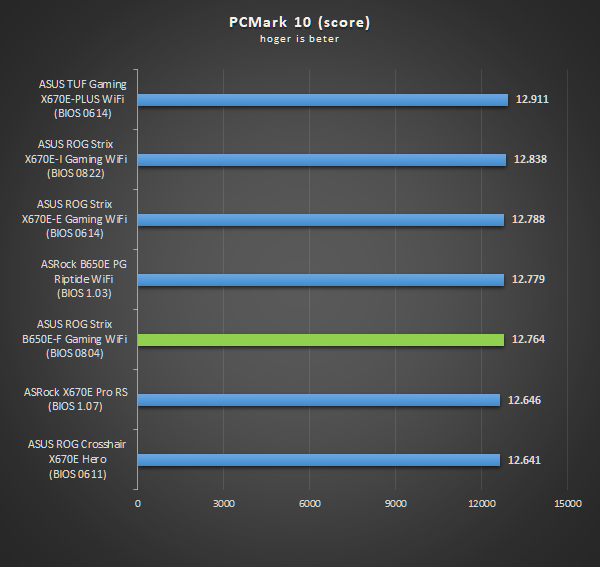 Hieronder zijn resultaten te vinden van de ASUS ROG Strix B650E-F Gaming WiFi i.c.m. de AMD Ryzen 9 7950X. Het doel is om in dit hoofdstuk een algemene indruk van prestaties te geven. Prestatieverschillen tussen moederborden zijn veelal marginaal en niet te herleiden in de praktijk, kortom, het verschil is niet significant. Belangrijker gespreksonderwerp bij moederborden zijn zaken zoals de prijs, features en algemene kenmerken.