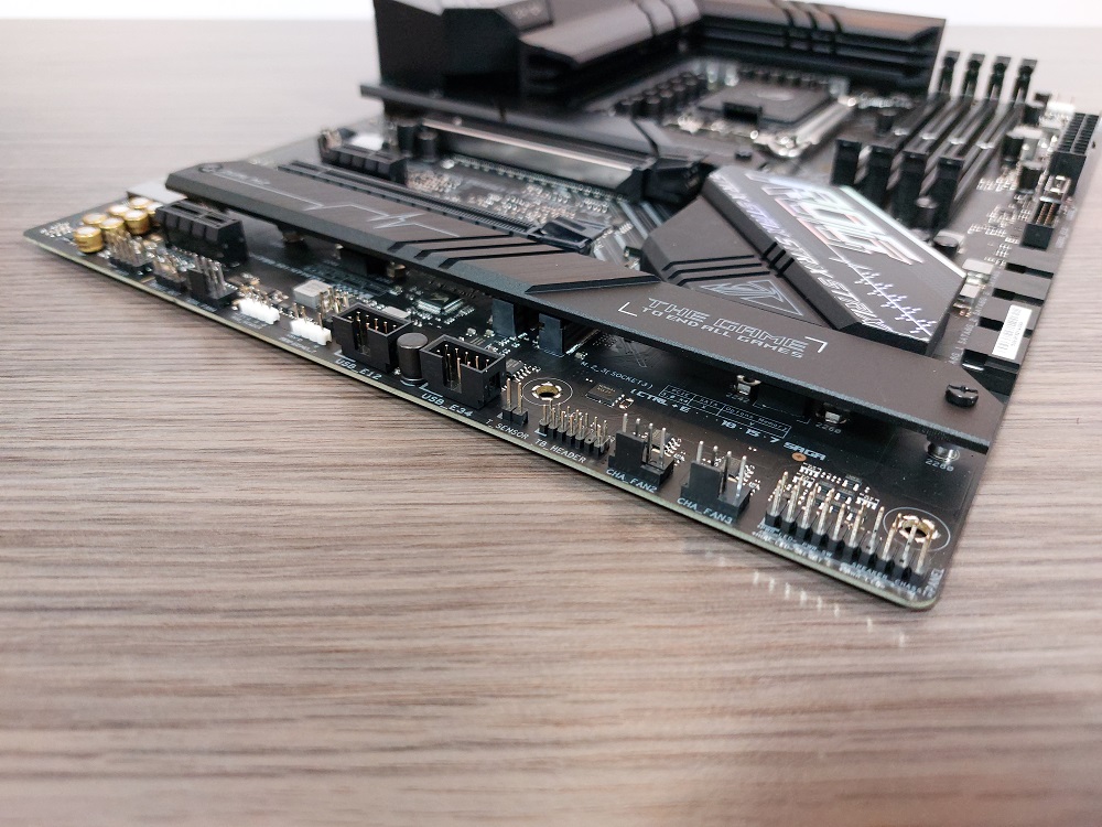 De DDR5-geheugensloten kunnen maximaal 128GB aan DDR5-werkgeheugen huisvesten. Overklokken van het werkgeheugen is mogelijk, waar het overklokken van de processor op B660 niet vertegenwoordigd is, hier moet je toch écht bij het Z690-moederbord kamp zijn. De VRM-heatsink siert op het moederbord, bovenaan het moederbord zijn de CPU_FAN, OPT EN AIO-header aanwezig. Dit zijn drie 4-pin headers. Het moederbord verkrijgt zijn voeding middels één 8-pin aansluiting en één 4-pin aansluiting.