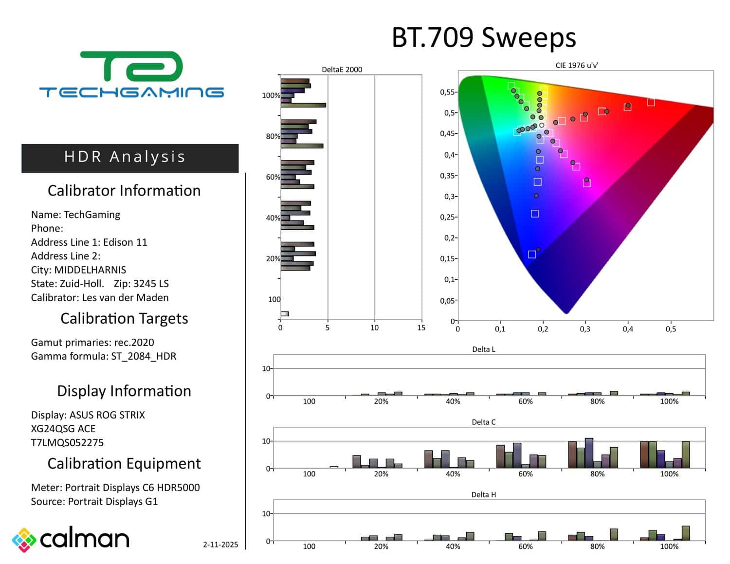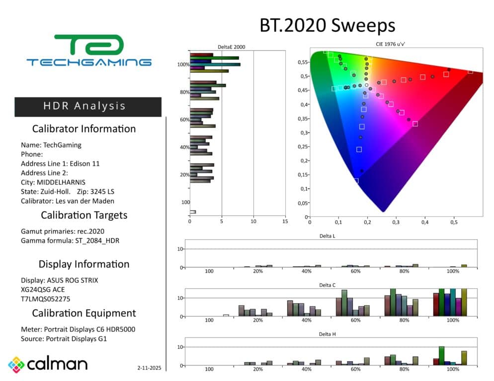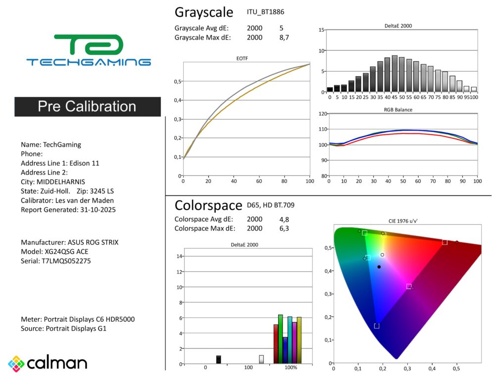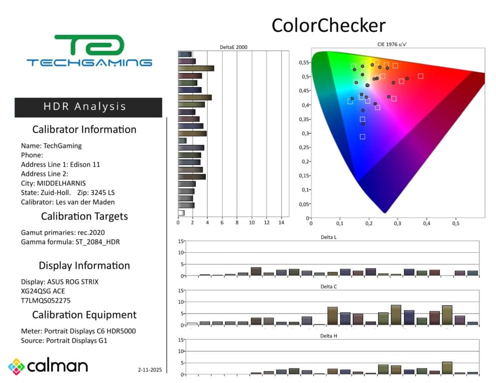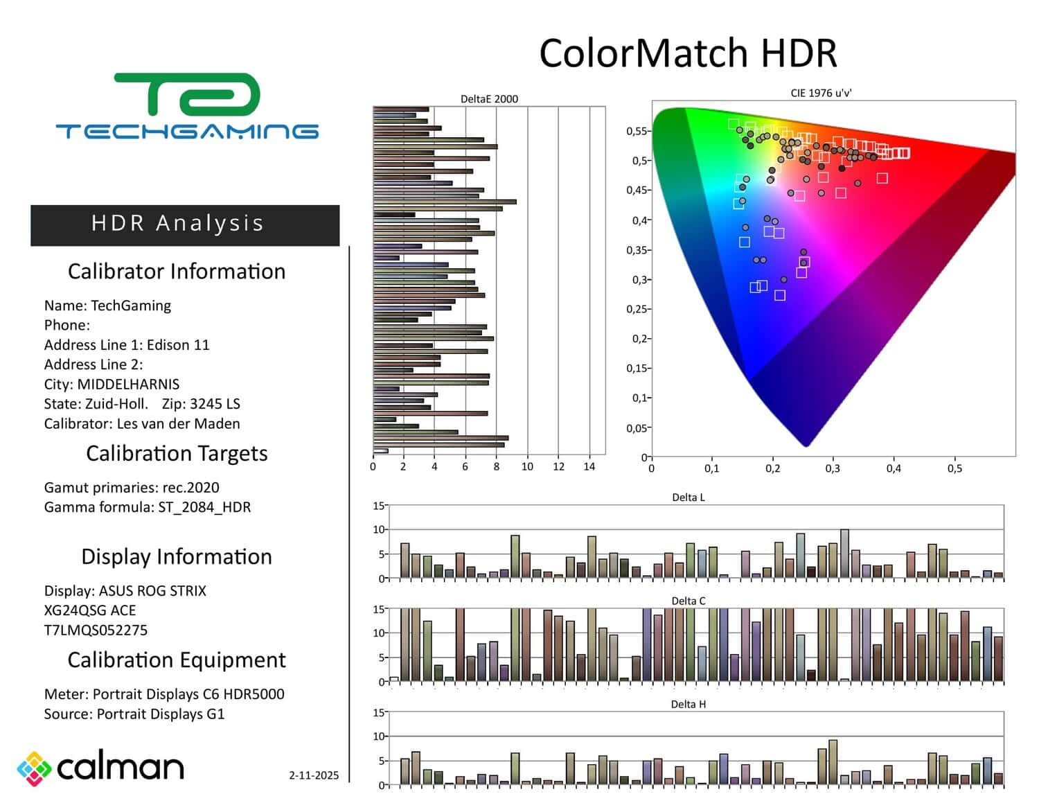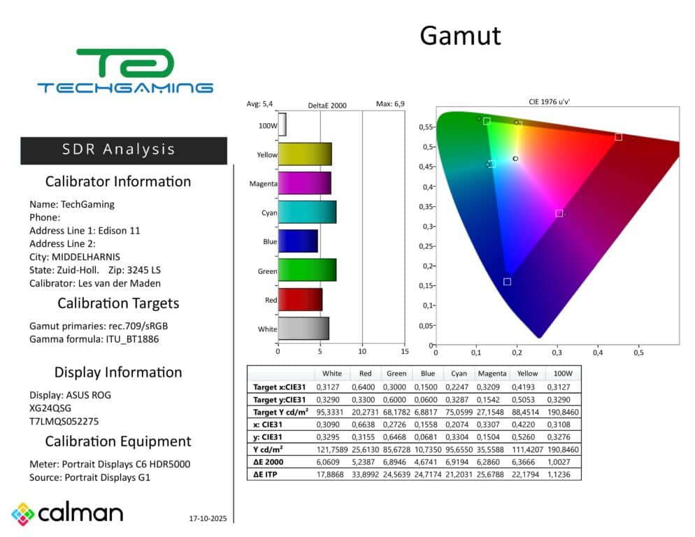 De ROG Strix XG248QSG ACE ondersteunt geen Direct Display Control. Dit betekent dat de Calman Studio niet zelf de kalibratie kan doen, maar dat het handmatig moet gebeuren. Wanneer de monitor in HDR-modus staat, kan er niet via de OSD handmatig gekalibreerd worden. We kunnen deze monitor niet kalibreren in HDR-modus en kunnen niet vergelijken hoe een kalibratie de monitor beter of slechter maakt ten opzichte van de fabrieksinstellingen uit de doos.