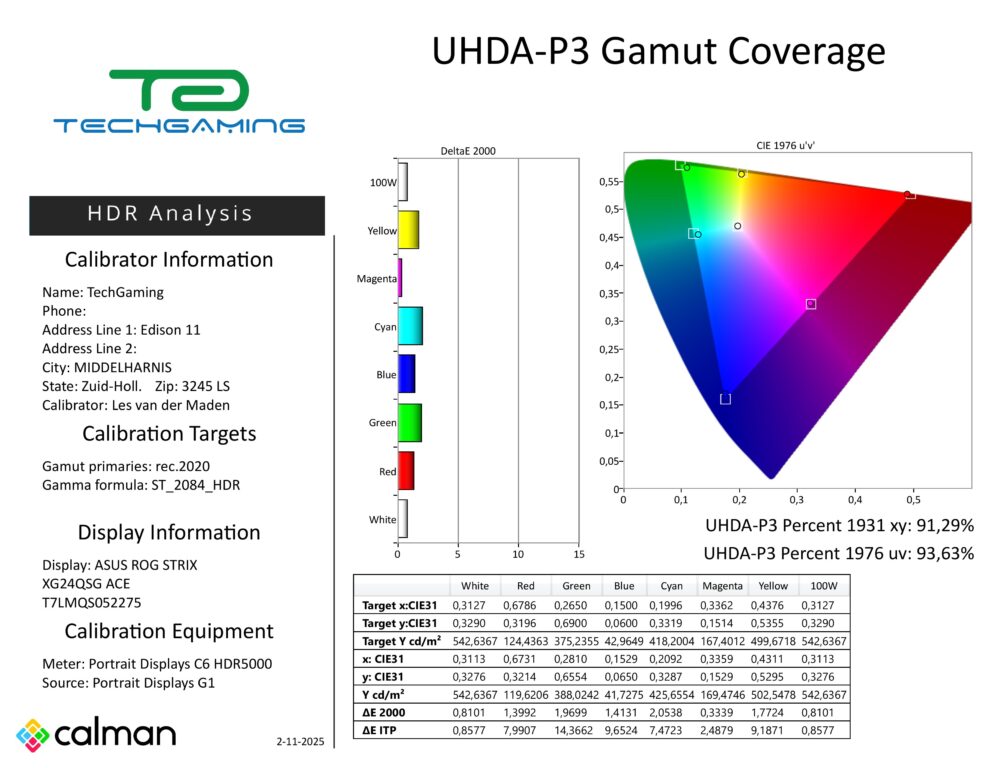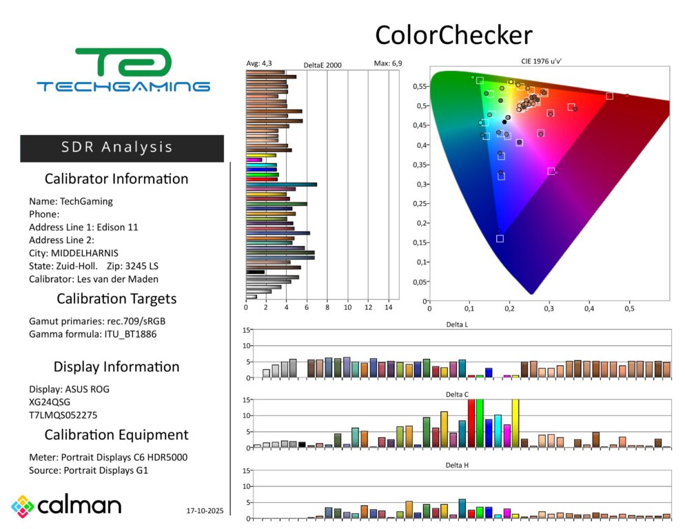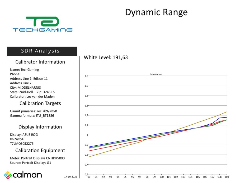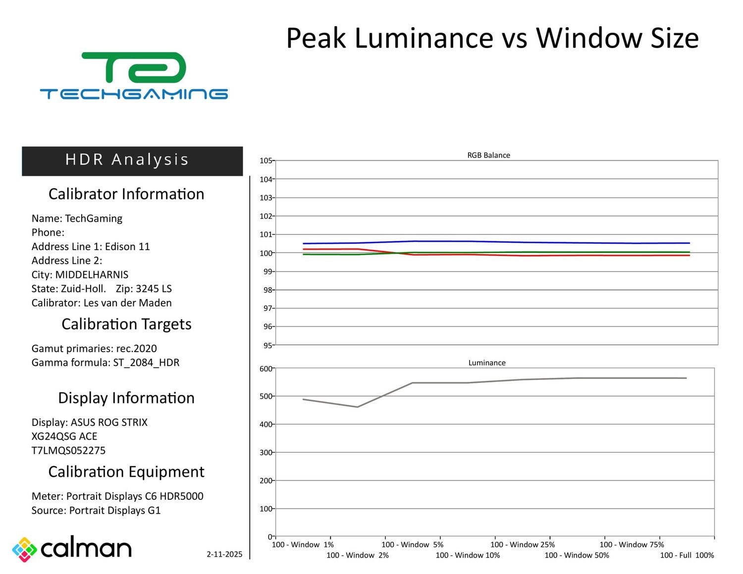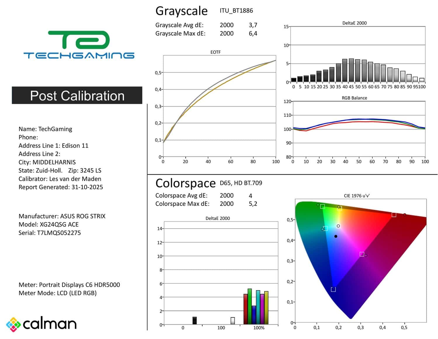 De ROG Strix XG248QSG ACE ondersteunt geen Direct Display Control. Dit betekent dat de Calman Studio niet zelf de kalibratie kan doen, maar dat het handmatig moet gebeuren. Wanneer de monitor in HDR-modus staat, kan er niet via de OSD handmatig gekalibreerd worden. We kunnen deze monitor niet kalibreren in HDR-modus en kunnen niet vergelijken hoe een kalibratie de monitor beter of slechter maakt ten opzichte van de fabrieksinstellingen uit de doos.