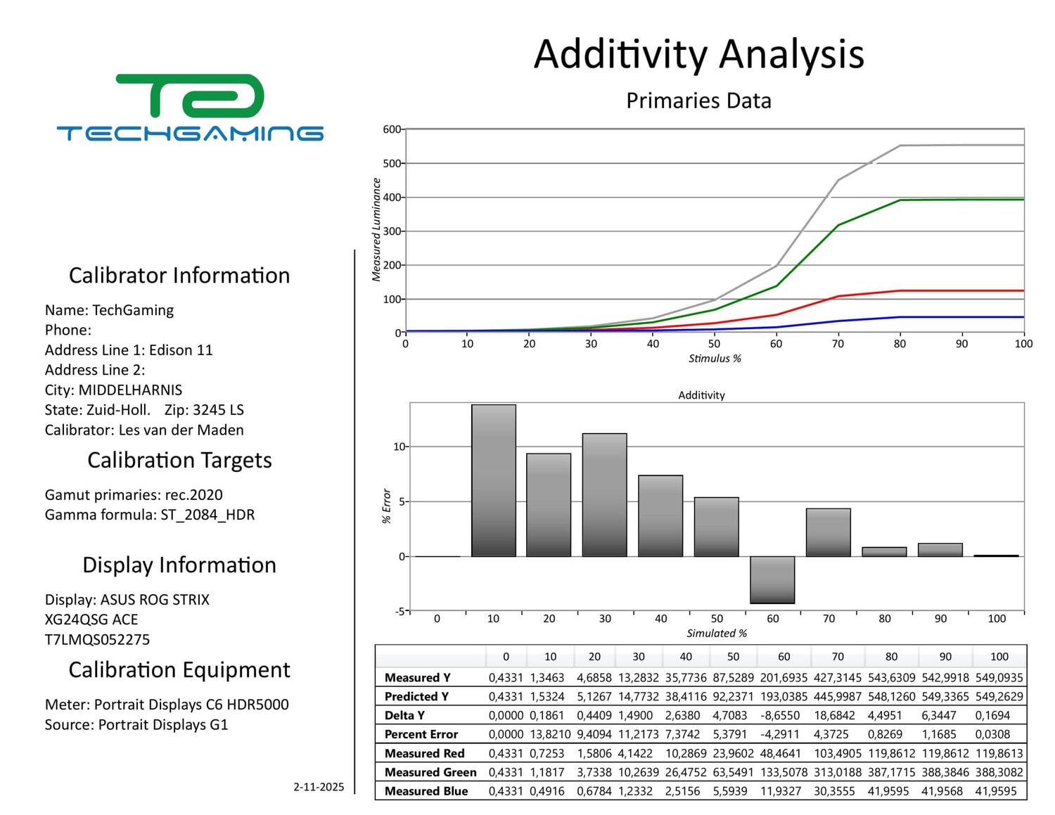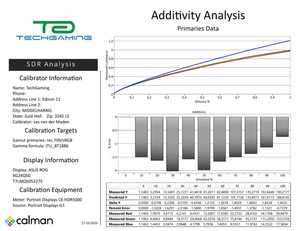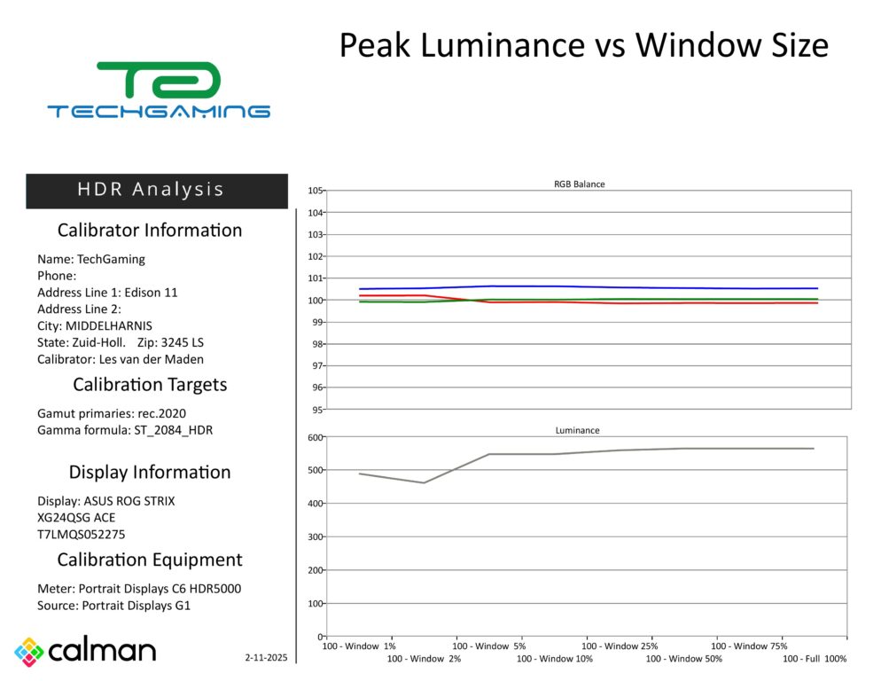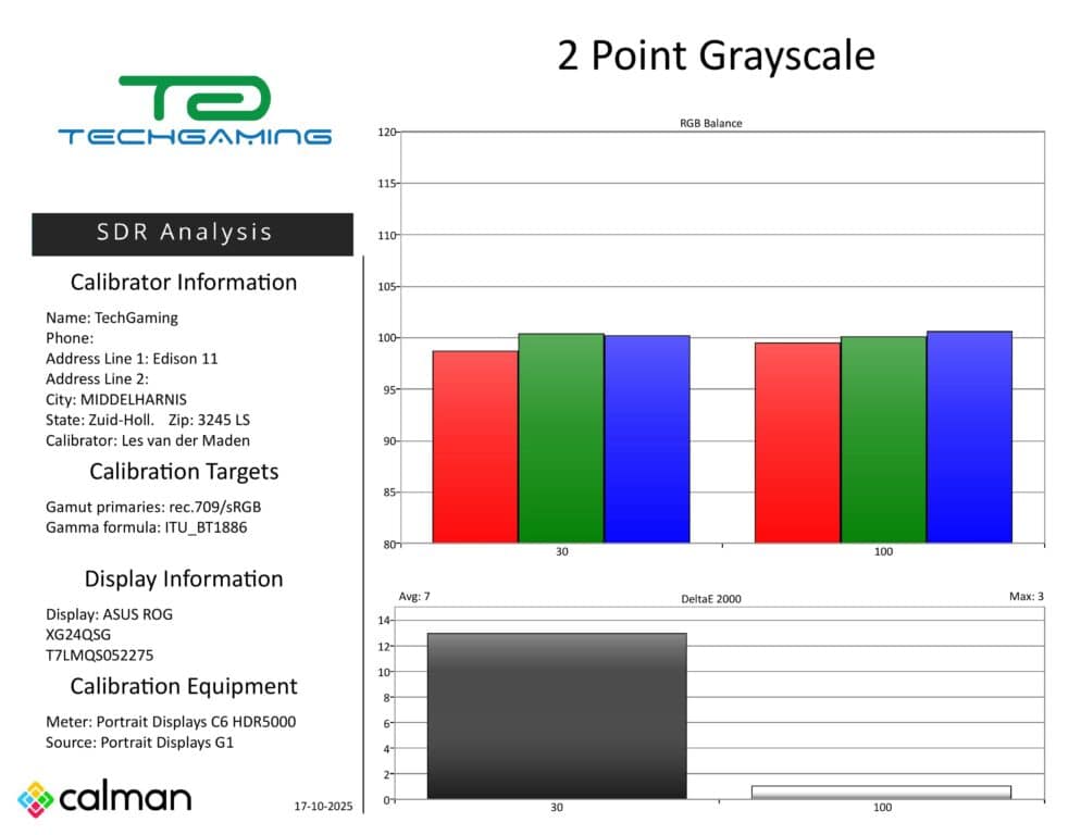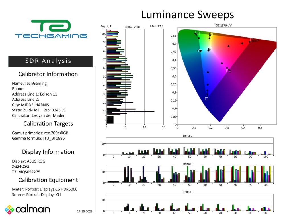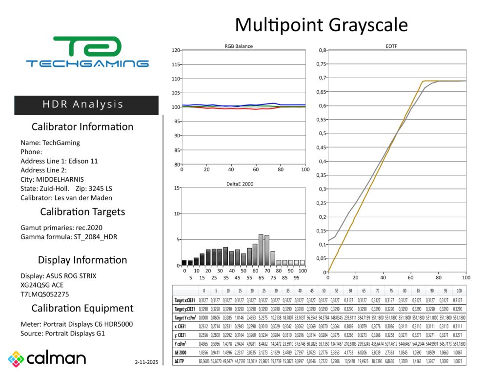 De ROG Strix XG248QSG ACE ondersteunt geen Direct Display Control. Dit betekent dat de Calman Studio niet zelf de kalibratie kan doen, maar dat het handmatig moet gebeuren. Wanneer de monitor in HDR-modus staat, kan er niet via de OSD handmatig gekalibreerd worden. We kunnen deze monitor niet kalibreren in HDR-modus en kunnen niet vergelijken hoe een kalibratie de monitor beter of slechter maakt ten opzichte van de fabrieksinstellingen uit de doos.