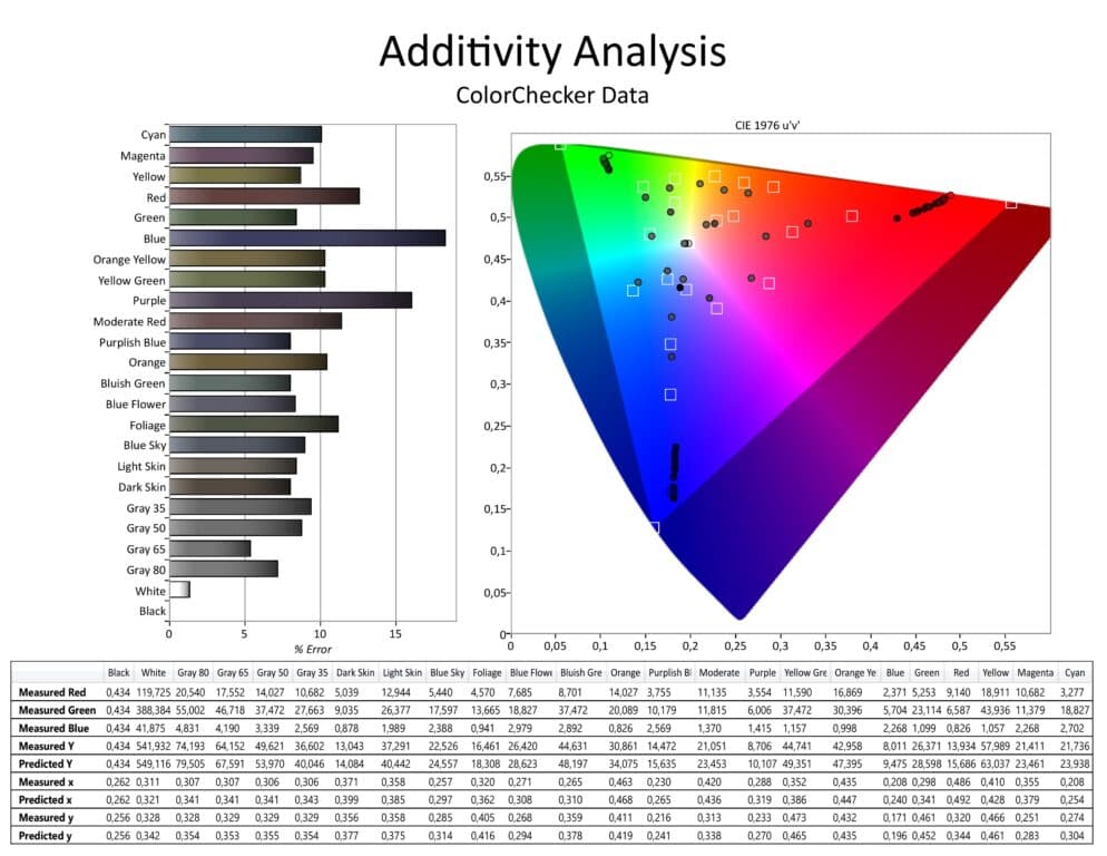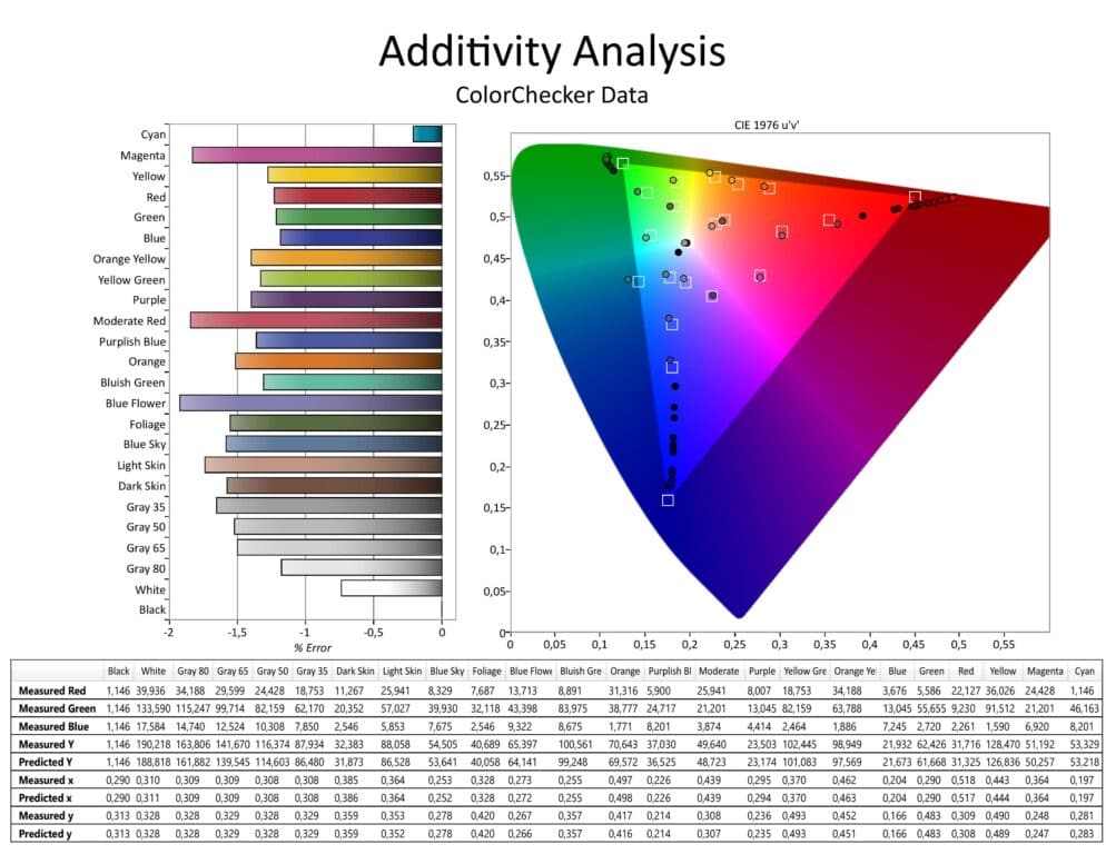 - Kleurreferentie: Metingen gebaseerd op het CIE 1976 u’v’-diagram.