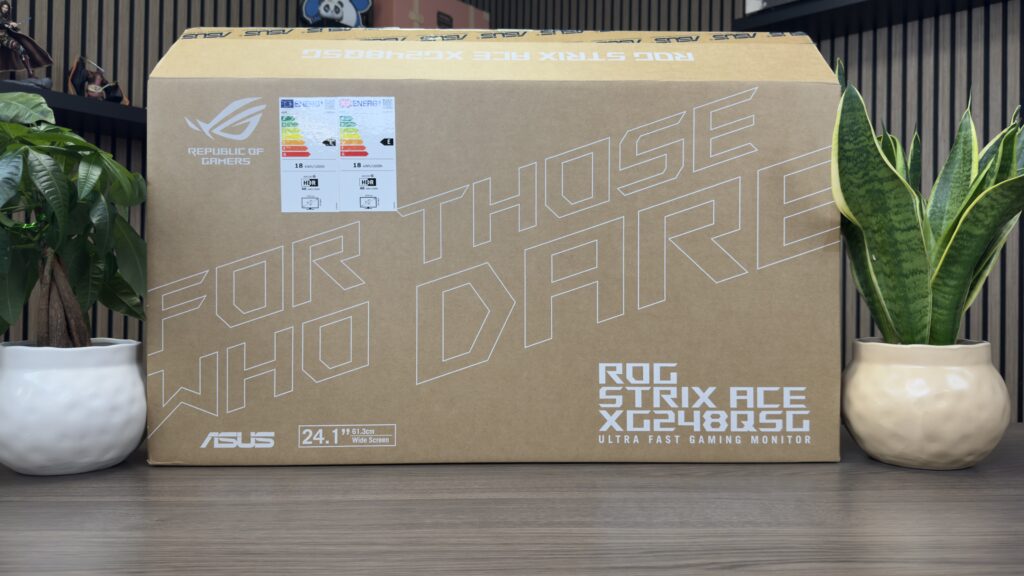Laten we beginnen met het uitpakavontuur. De ASUS ROG Strix XG248QSG ACE komt in een stevige, herkenbare verpakking die direct laat zien dat het om een ROG-product gaat. De grote tekst “For Those Who Dare" vult bijna de hele voorkant en zet meteen de toon. Rechts onderin staan de specificaties vermeld, inclusief het formaat van 24,1 inch.