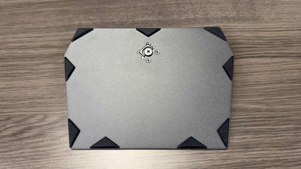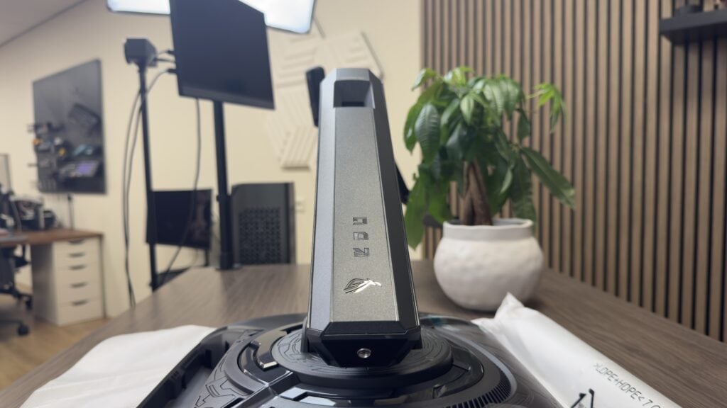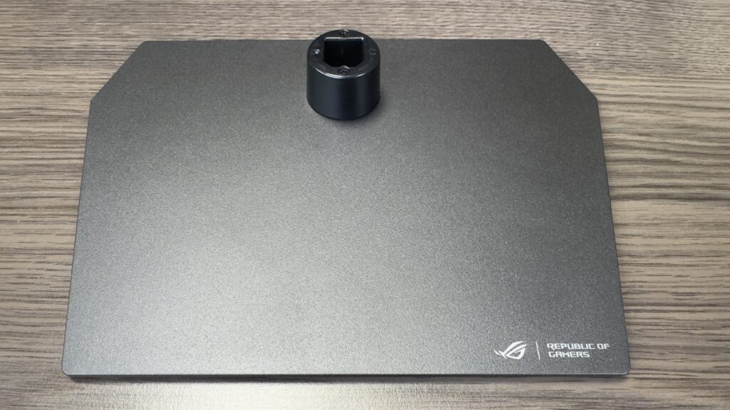 De voetplaat heeft een strak matgrijs oppervlak met subtiele lijnen en een klein ROG-logo in de hoek. De onderzijde is voorzien van rubberen stroken, zodat de monitor stabiel blijft staan. De arm en afdekplaat sluiten mooi op elkaar aan en voelen degelijk aan zodra ze worden gemonteerd. Op de laatste foto’s zijn de kabels en voedingsadapter beter zichtbaar.