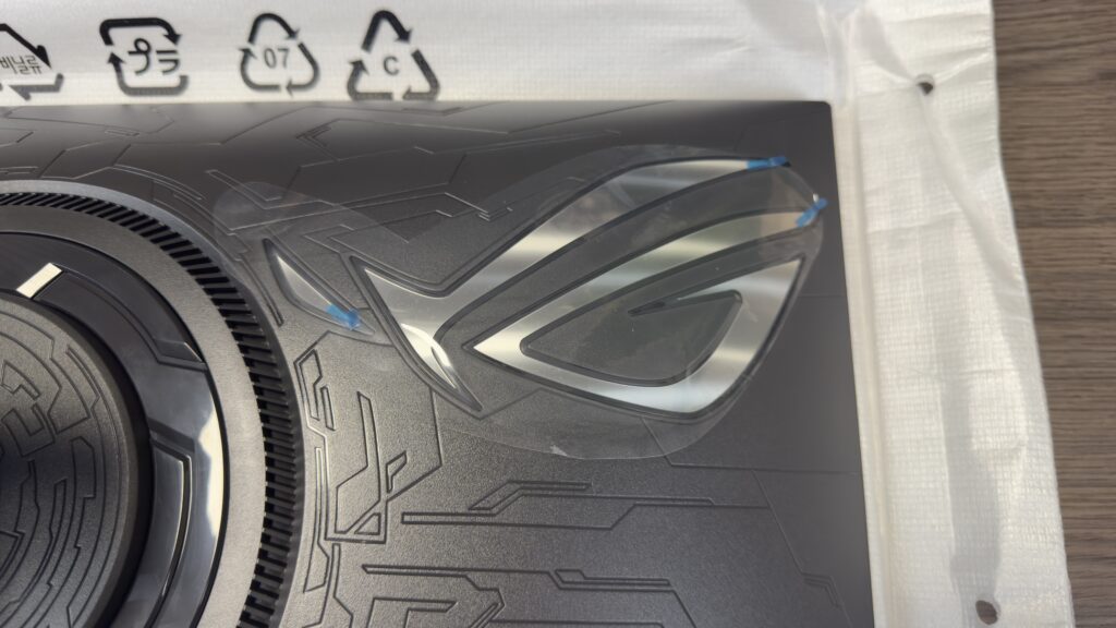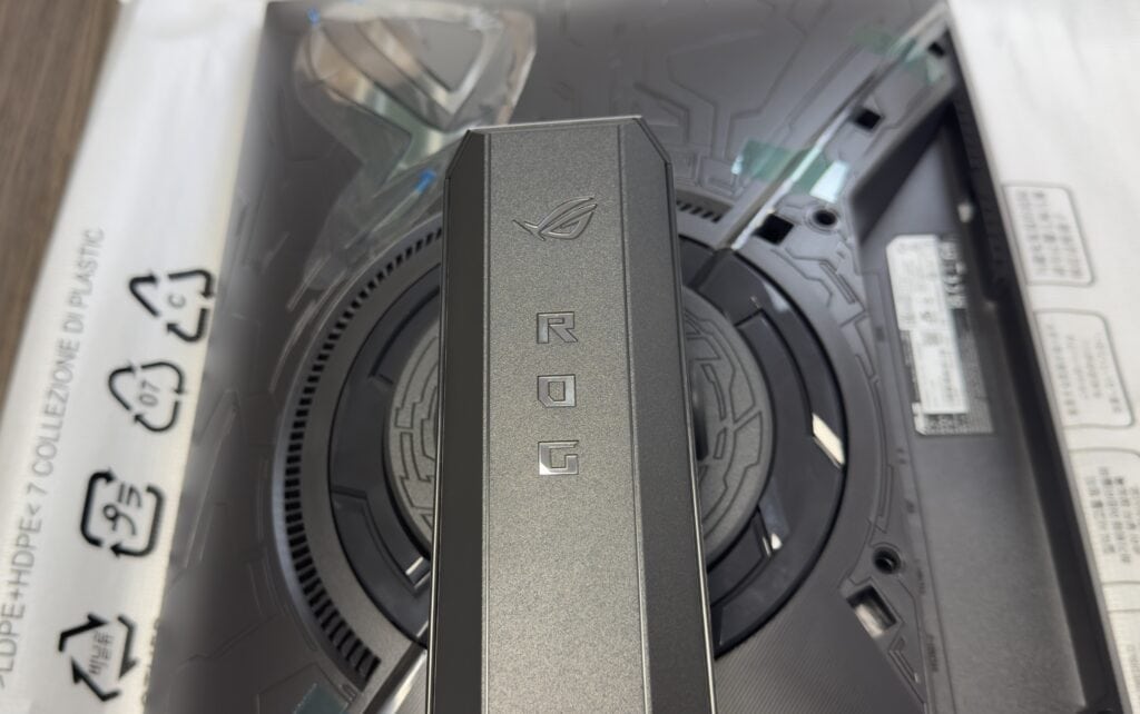 We halen het piepschuim en de beschermfolie van de monitor af. We treffen dan voor het eerst de achterkant van de monitor aan, met het statief aan de monitor bevestigd. Het ontwerp combineert strakke lijnen met herkenbare ROG-accenten, waaronder het diagonale patroon en het subtiel geïntegreerde logo aan de rechterzijde. De matte afwerking oogt modern en voelt stevig aan, zonder overbodige franje.