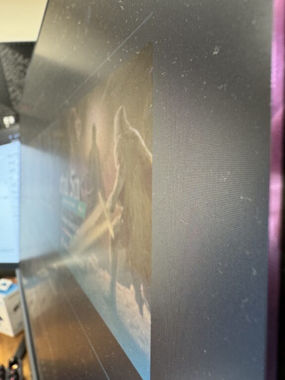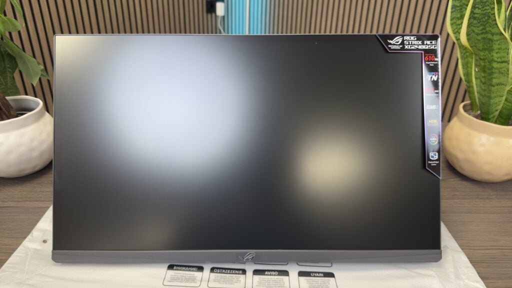 We draaien de monitor om en zien nu een vooraanzicht van de monitor. Aan de voorkant oogt de ROG Strix XG248QSG ACE strak en modern. Het schermoppervlak heeft een matte afwerking die reflecties goed tegengaat, dit is te zien aan de belichting op de foto. Onderaan zien we subtiel het ROG-logo, verwerkt in de onderrand van het frame. Rechtsboven heeft ASUS de bekende stickers geplaatst met de belangrijkste specificaties, waaronder de 610 Hz-verversingssnelheid en 1 ms responstijd.