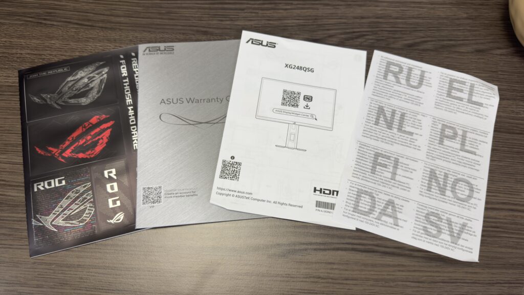 Op de eerste foto’s zijn de meegeleverde onderdelen overzichtelijk uitgestald: de stevige metalen voet, de kenmerkende ROG-stijl kap, en de handleidingen met wat stickers en garantiepapieren. Het geheel oogt verzorgd — ASUS kiest hier voor praktisch, zonder overbodige poespas.