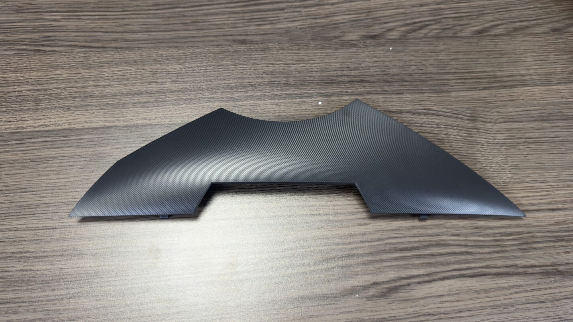 Op de laatste reeks foto’s is het kenmerkende ROG-patroon nog beter zichtbaar. De subtiele lijnen en glanzende afwerking rondom de ventilatieopening geven het geheel een premium look, terwijl de stevige voetconstructie ervoor zorgt dat het scherm stabiel blijft staan.