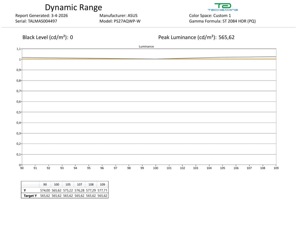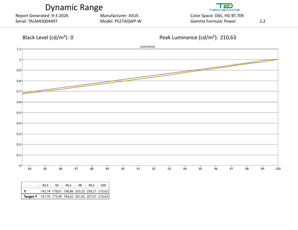 De SDR-metingen zijn uitgevoerd met een gamma target van Power 2.2, wat de standaard is voor SDR-weergave. De dynamic range laat zien dat het paneel in staat is om volledig zwart weer te geven, met een gemeten zwartwaarde van 0 cd/m².
