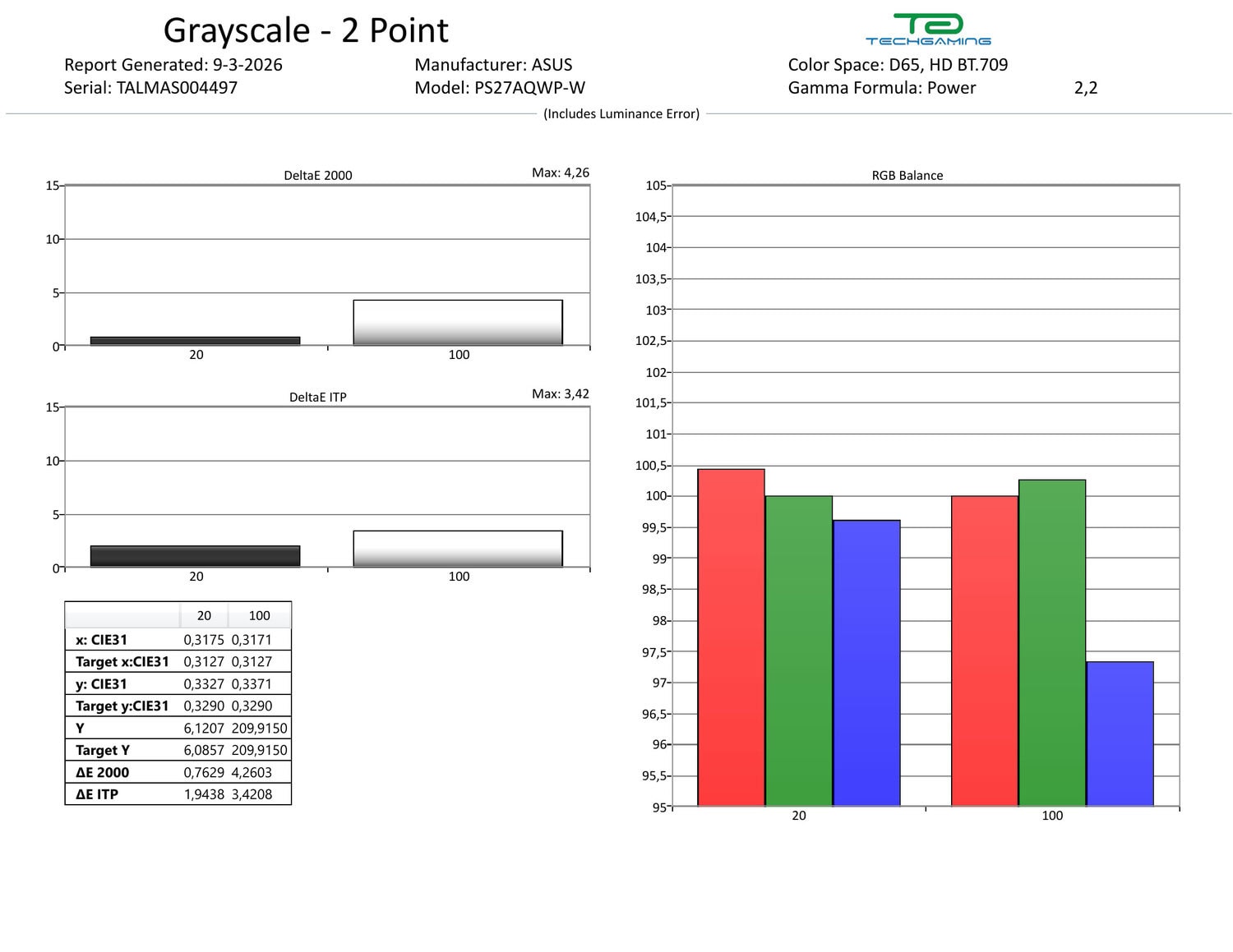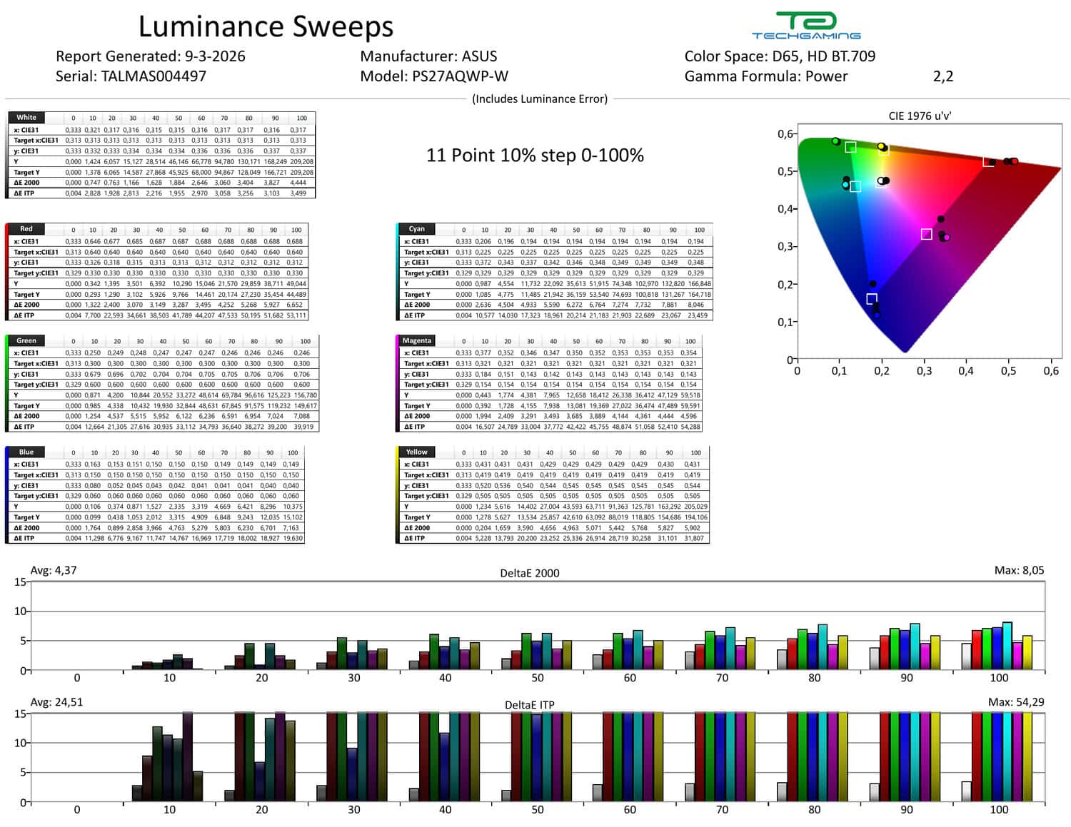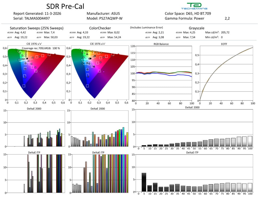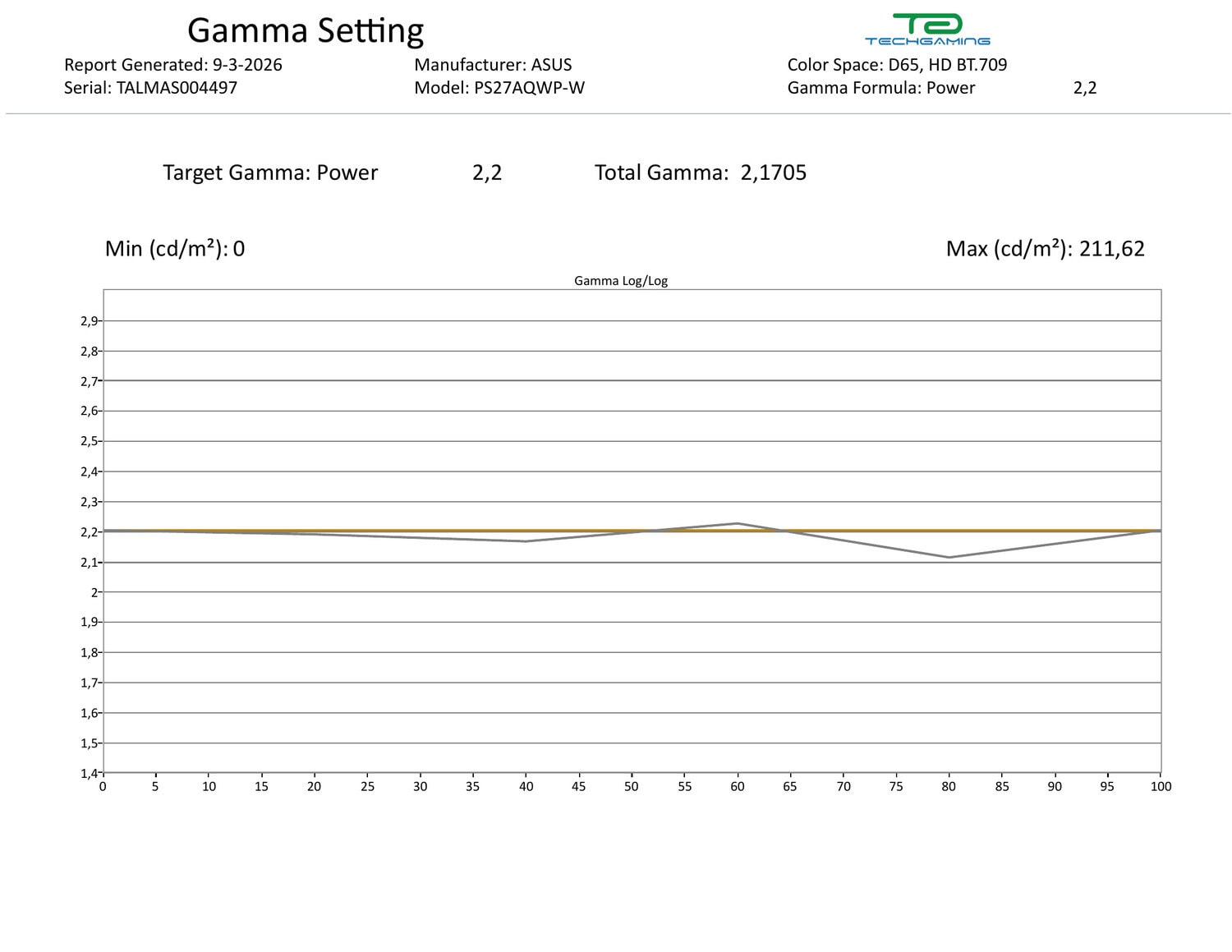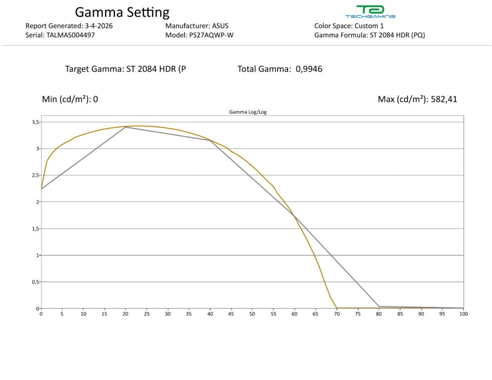 In combinatie met de maximale luminantie resulteert dit in een praktisch oneindige contrastverhouding. De maximale luminantie ligt binnen het bereik dat geschikt is voor SDR-gebruik. Dit zorgt voor een voldoende helder beeld voor gebruik in standaard binnenomgevingen. De gammaweergave volgt over het algemeen de beoogde 2.2-curve. De grijsbalans toont dat de RGB-kanalen grotendeels in lijn liggen met beperkte afwijkingen over het gehele bereik.